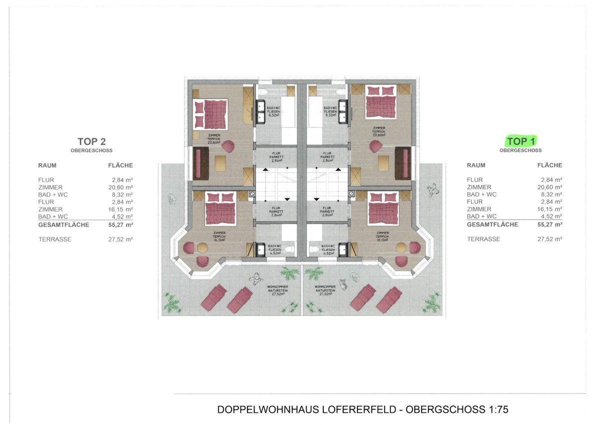 Im Obergeschoss befinden sich zwei exklusive Schlafzimmer, die durch die versetzten Ebenen ein Höchstmaß an Privatsphäre bieten. Das nördlich gelegene Schlafzimmer verfügt über ein eigenes Bad mit Badewanne, separater Dusche, Doppelwaschbecken und WC. Das südliche Schlafzimmer bietet durch den Erker und den direkten Zugang zur sonnigen Terrasse einen besonderen Charme und ist ebenfalls mit einem eigenen Bad mit Dusche und WC ausgestattet.