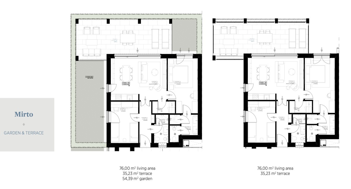 L'appartamento «Mirto», con una superficie di 76 m², è un'oasi abitativa arredata con gusto. L'appartamento dispone di un'ampia zona soggiorno-cucina da cui si accede al balcone di 32 m². Due accoglienti camere da letto, due bagni moderni e una lavanderia con ripostiglio completano l'unità abitativa. L'appartamento incarna il lusso e l'alta qualità con stile e offre un'opportunità unica per godersi uno stile di vita confortevole in un ambiente esclusivo.