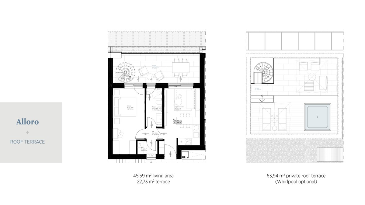 L'attico «Alloro», con una superficie di 45 m², è un'elegante oasi abitativa. Oltre al balcone di 22 m², potrete godervi splendidi tramonti sulla vostra terrazza sul tetto di 63 m². Qui potrete anche realizzare il vostro sogno di avere una zona benessere privata con piscina o vasca idromassaggio.
