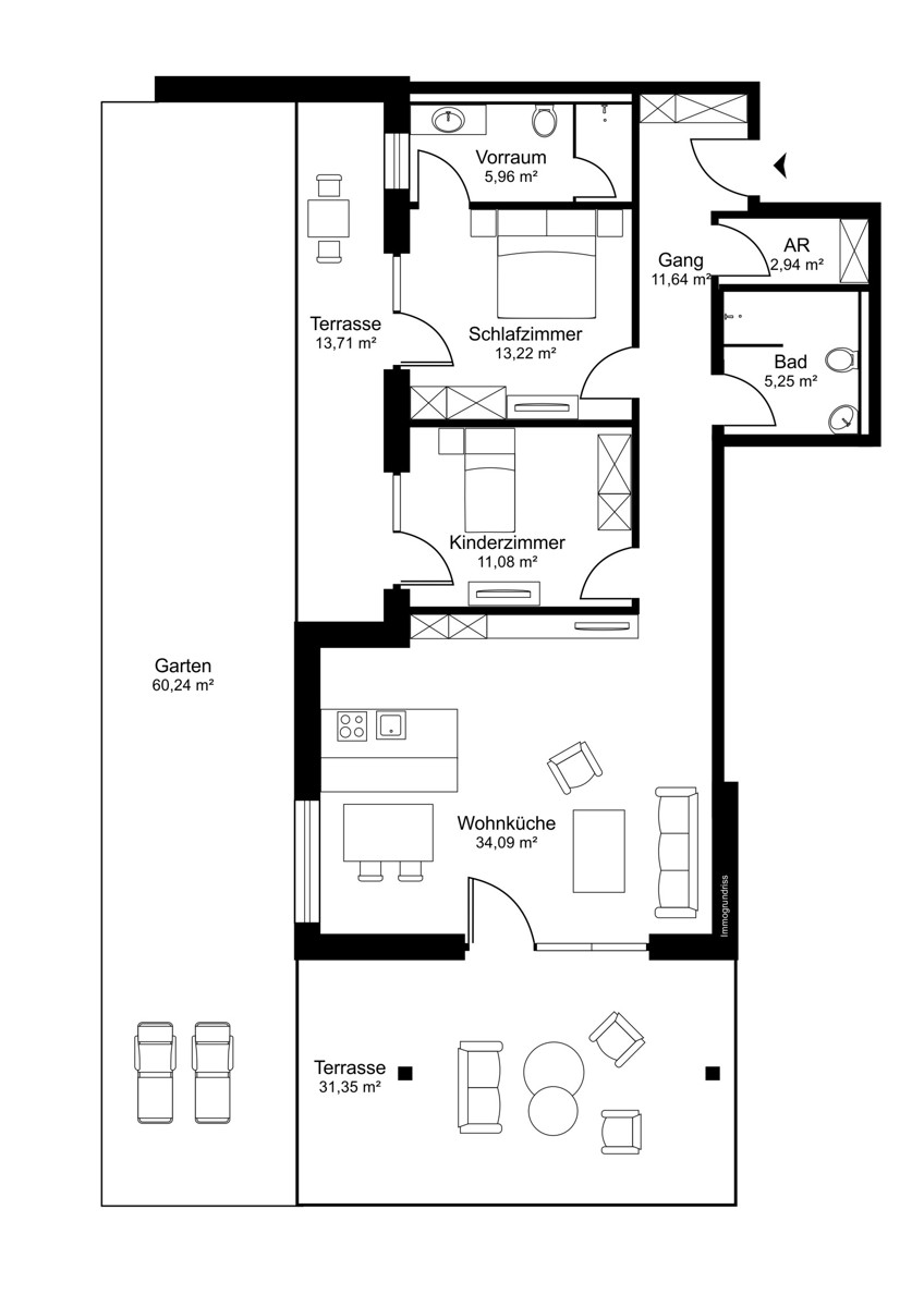 L'appartamento Top 4, situato al primo piano, offre una superficie abitabile di 84,18 m² e colpisce per la sua ampia terrazza di 31,35 m² e per il giardino privato di 60,24 m². Questo trilocale dispone di due camere da letto, una delle quali dotata di bagno privato con doccia, che grazie al collegamento con la camera da letto crea una sensazione di spazio unica. Un ulteriore bagno separato garantisce un comfort aggiuntivo.