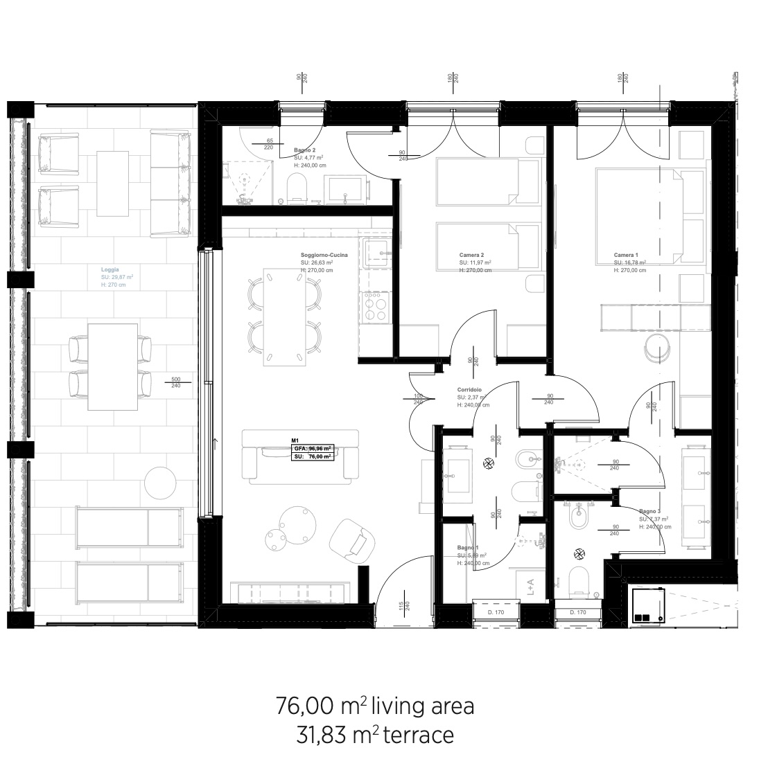 Het appartement type "Olivio" is de perfecte woonoase met een oppervlakte van 76 m². Het heeft een woon-/keukengedeelte met toegang tot het balkon van 31 m². 2 gezellige slaapkamers en 2 moderne badkamers, een praktische wasruimte met opbergruimte en een gastentoilet maken de wooneenheid compleet. De flat belichaamt luxe, hoge kwaliteit met stijl en biedt een unieke kans om te genieten van een comfortabele levensstijl in een exclusieve omgeving.