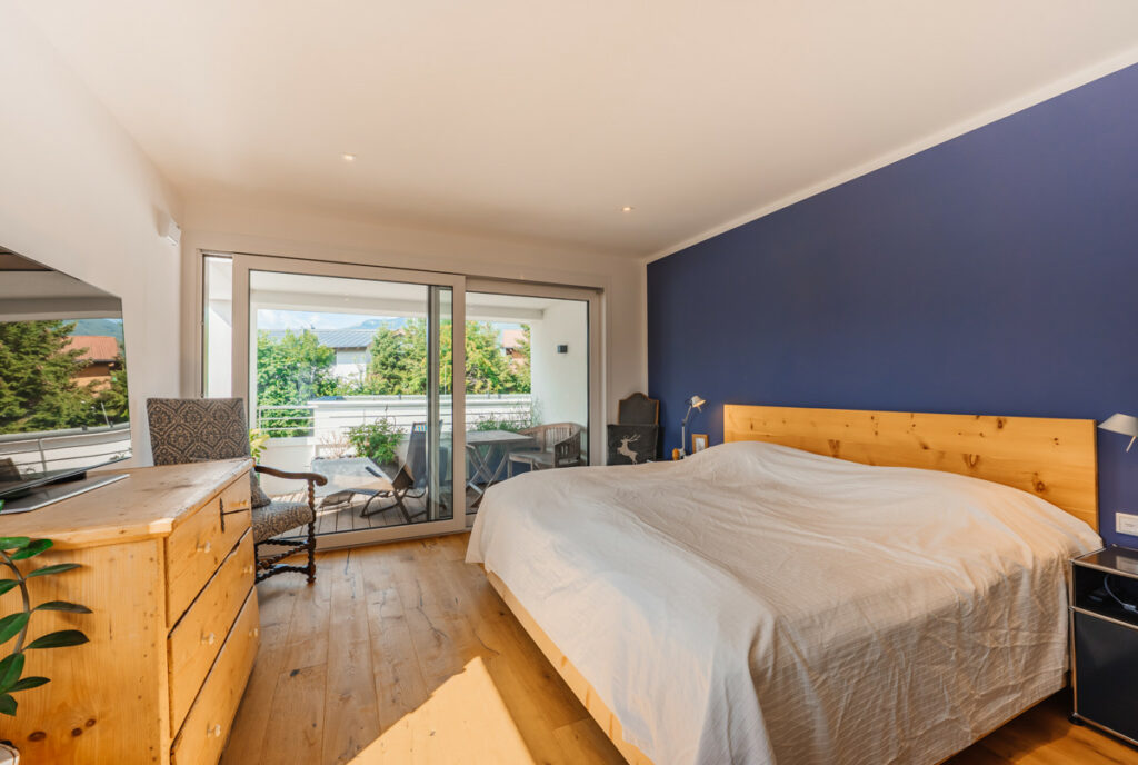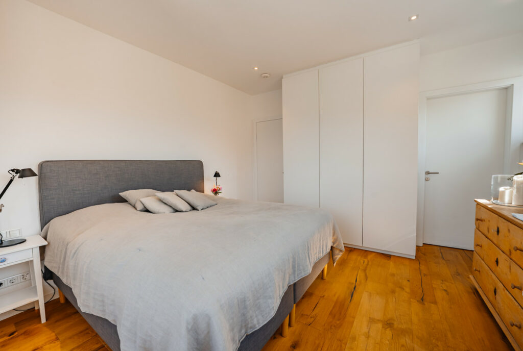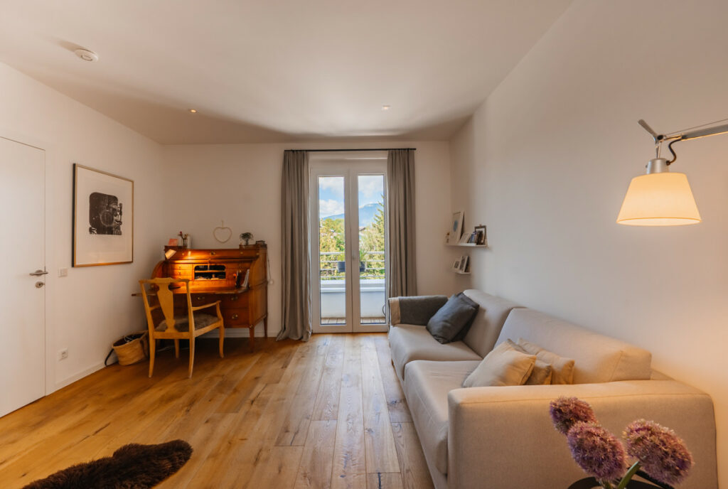 Die untere Etage dieser Maisonette ist nahezu eigenständig gestaltet und bietet viel Raum zur individuellen Nutzung. Sie umfasst ein Schlafzimmer mit direktem Zugang zu einem Balkon, ein großzügiges Bad und WC sowie einen zusätzlichen Raum, der flexibel als weiteres Schlafzimmer, Büro, Gästezimmer oder Ankleide genutzt werden kann. Diese klare Aufteilung sorgt für eine funktionale Trennung der Bereiche und schafft eine ideale Balance zwischen Privatsphäre und gemeinschaftlichem Wohnen.