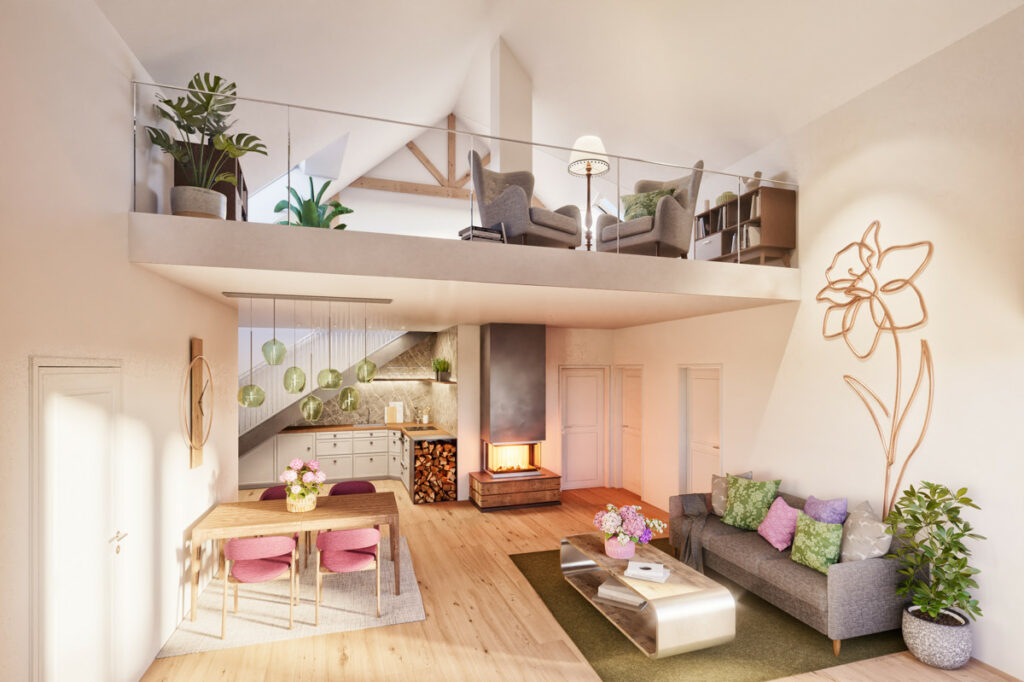 Ein weiteres Highlight dieser Wohnung ist die großzügige Wohngalerie mit einer beeindruckenden Fläche von 43 m² und eine Dachterrasse von ca. 13 m². Sie bietet einen Wohnküche und Essbereich und bietet kreative Gestaltungsmöglichkeiten in luftigem Ambiente. Hier eröffnet sich ein Rückzugsort, der höchsten Ansprüchen gerecht wird.