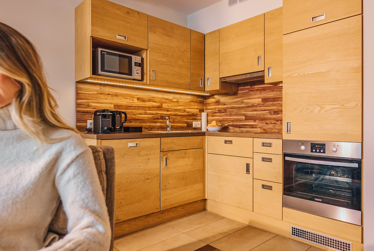 Der großzügige Wohn- und Essbereich bildet den kommunikativen Mittelpunkt des Appartements. Die komplett ausgestattete Küche lädt zu gemeinsamen Kochabenden ein, während große Fensterflächen den Raum mit Licht füllen und die umliegende Bergwelt zum ständigen Begleiter machen. Der Balkon erweitert den Wohnraum ins Freie und bietet den idealen Platz für den ersten Kaffee am Morgen oder einen entspannten Tagesausklang mit Weitblick. Ein eigenes, verschließbares Skidepot ergänzt das Appartement funktional und komfortabel.