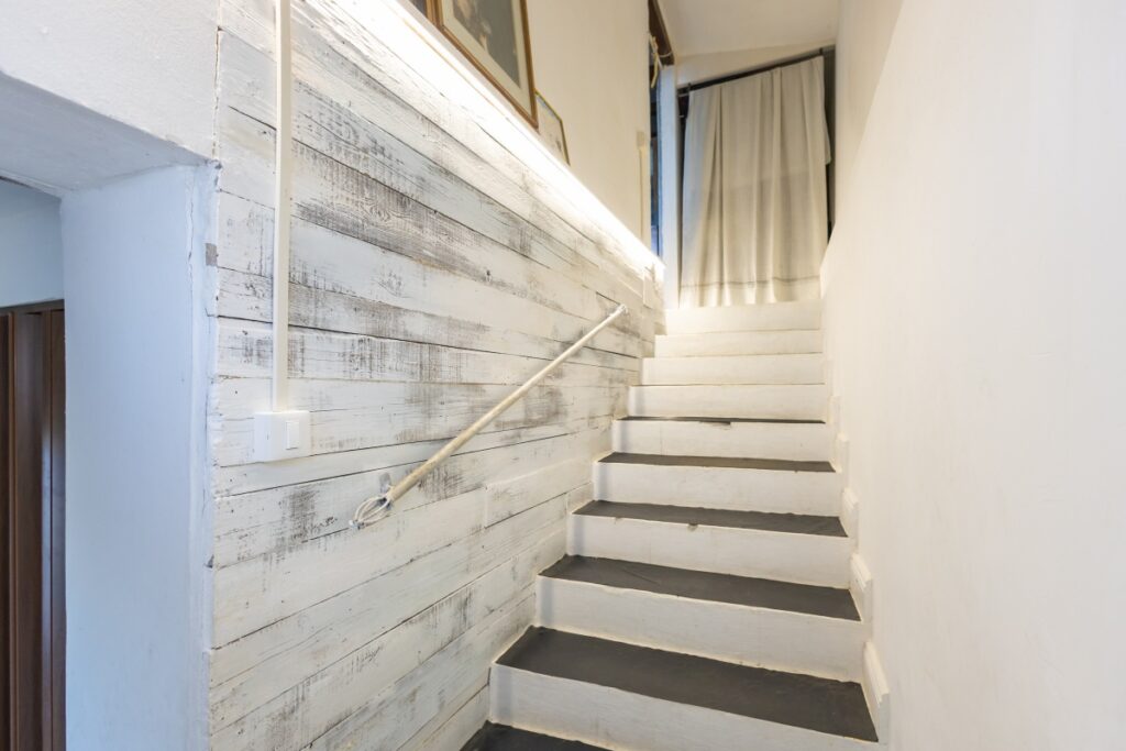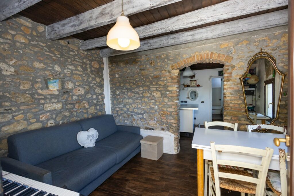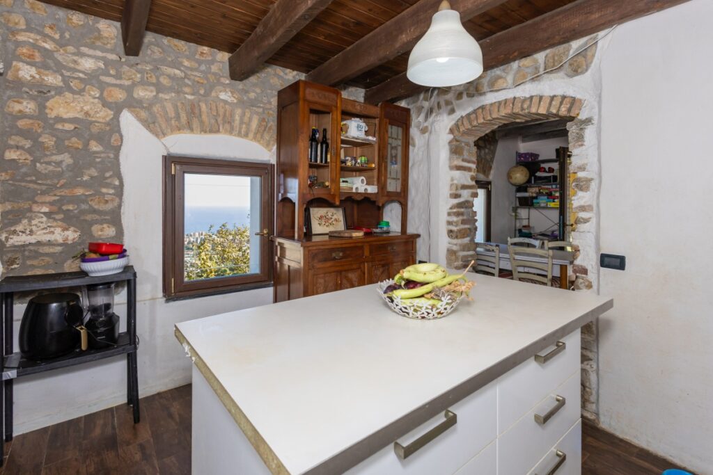 Die zum Verkauf stehende Villa Italien in Arma di Taggia erstreckt sich auf zwei Etagen und teilt sich wie folgt auf: kleines Wohnzimmer, das von der spektakulären Eingangsterrasse aus zugänglich ist, Wohnküche und ein Badezimmer im Erdgeschoss. Über eine kurze Treppe gelangen Sie in den ersten Stock, hier befinden sich drei Schlafzimmer, von denen zwei Zugang zu ihren jeweiligen Panoramaterrassen haben, zweites Badezimmer und ein Wohnzimmer, das auch von außen über eine Treppe zugänglich ist.