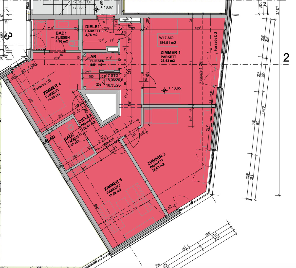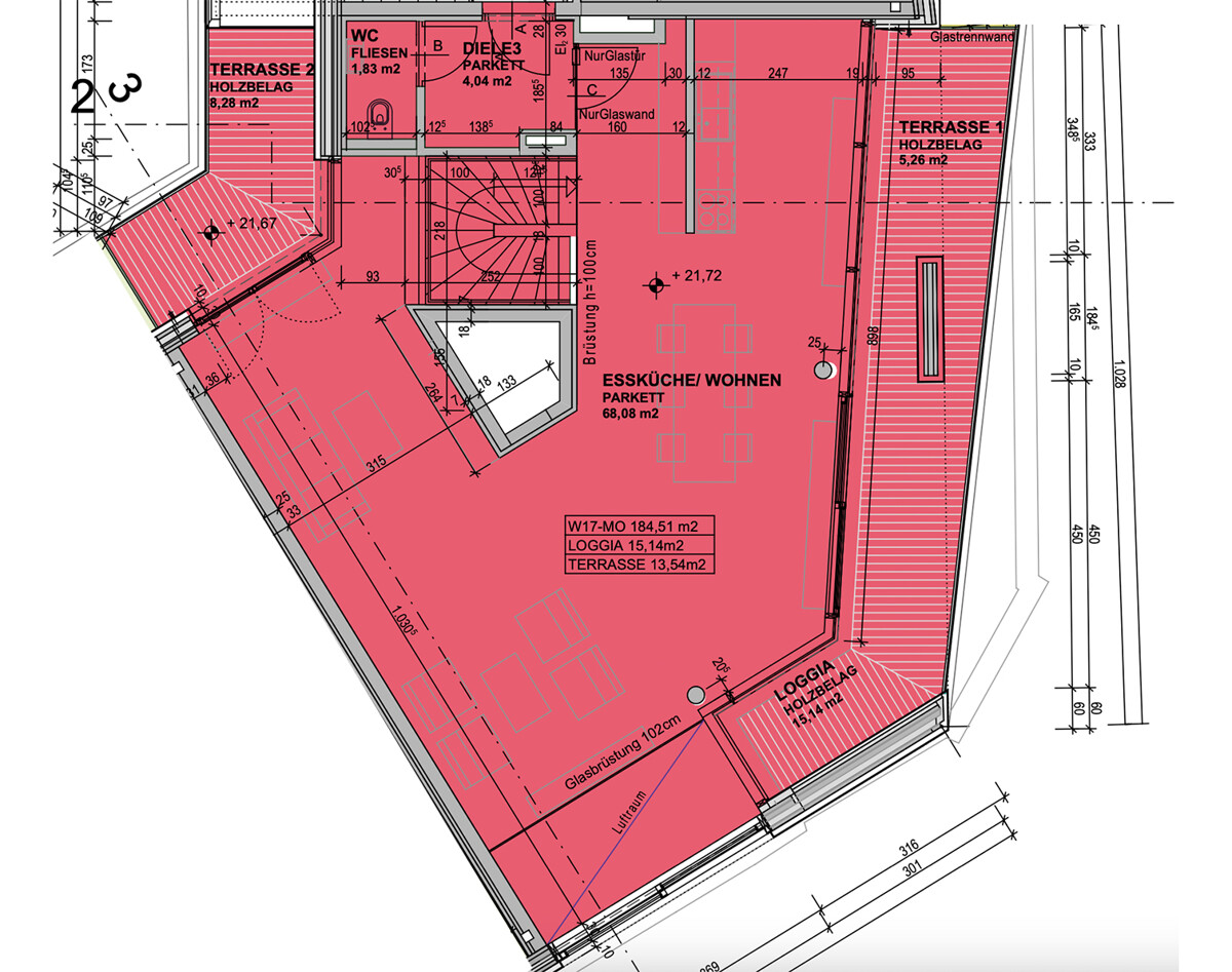 Das Dachgeschoss mit ca. 74 m² bildet das Herzstück der Wohnung, welches auch mit dem Personenlift zu erreichen ist und hier Gäste direkt empfangen werden können, ohne in die Privaträume zu kommen. Ein lichtdurchfluteter, weitläufiger Küchen-Ess-Wohnbereich, der Offenheit, Wohnkomfort und Repräsentativität auf ideale Weise verbindet. Hochwertige Echtholzparkettböden verleihen den offen gestalteten Wohnbereichen eine warme, einladende Atmosphäre und unterstreichen den gehobenen Anspruch dieser Immobilie.