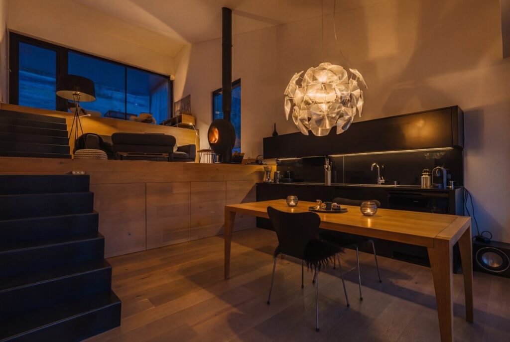Eine halbe Ebene darüber öffnet sich der Wohnbereich mit Sofa und Kaminofen. Die leicht erhöhte Position sorgt für eine angenehme räumliche Trennung zur Küche, während das offene Raumkonzept erhalten bleibt. Große Fensterflächen schaffen auch hier eine helle Atmosphäre und eine starke Verbindung zur umliegenden Landschaft.