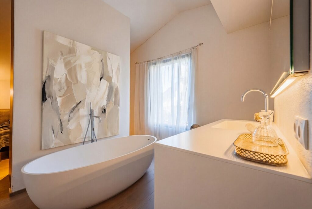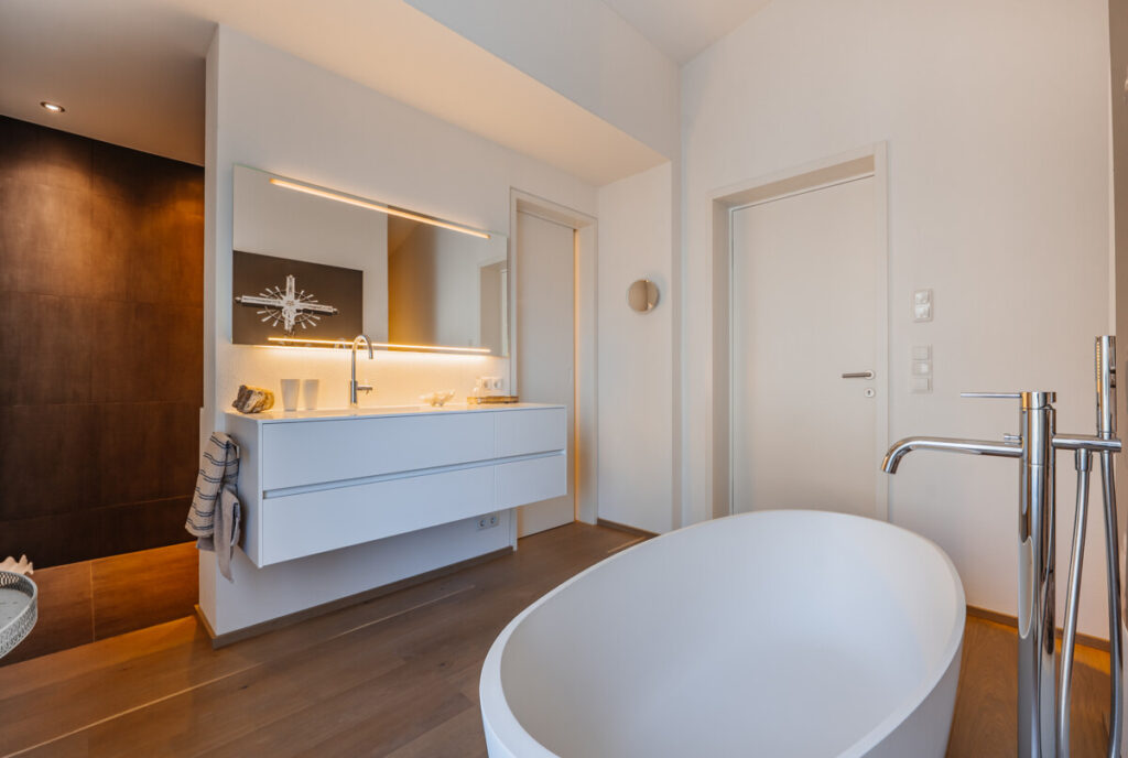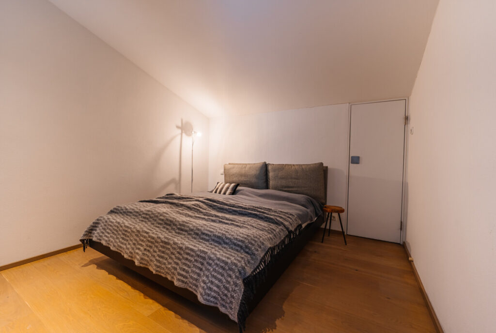 Ebenso führt in der 3. Ebene eine Tür in den privaten Schlafbereich des Hauses. Beim Betreten öffnet sich zunächst der offene Badbereich mit freistehender Badewanne, der dem Raum eine besonders ruhige und entspannte Atmosphäre verleiht. Rechts befindet sich der Duschbereich. Links um die Ecke schließt sich das Schlafzimmer an. In die Wand integriert befindet sich eine unauffällige Tür, die Zugang zu einem Dachboden bzw. zusätzlichen Abstellraum bietet. Der gesamte Bereich ist offen und reduziert gestaltet und unterstreicht den architektonischen Charakter des Hauses.