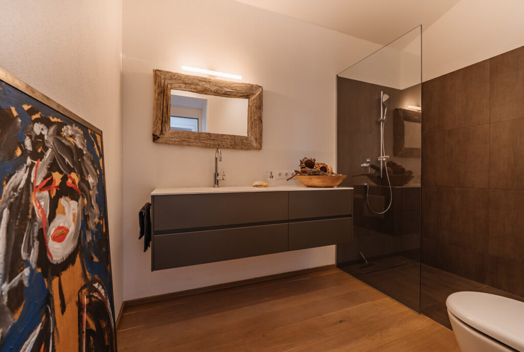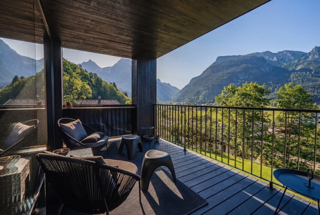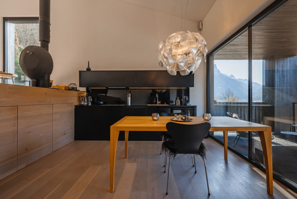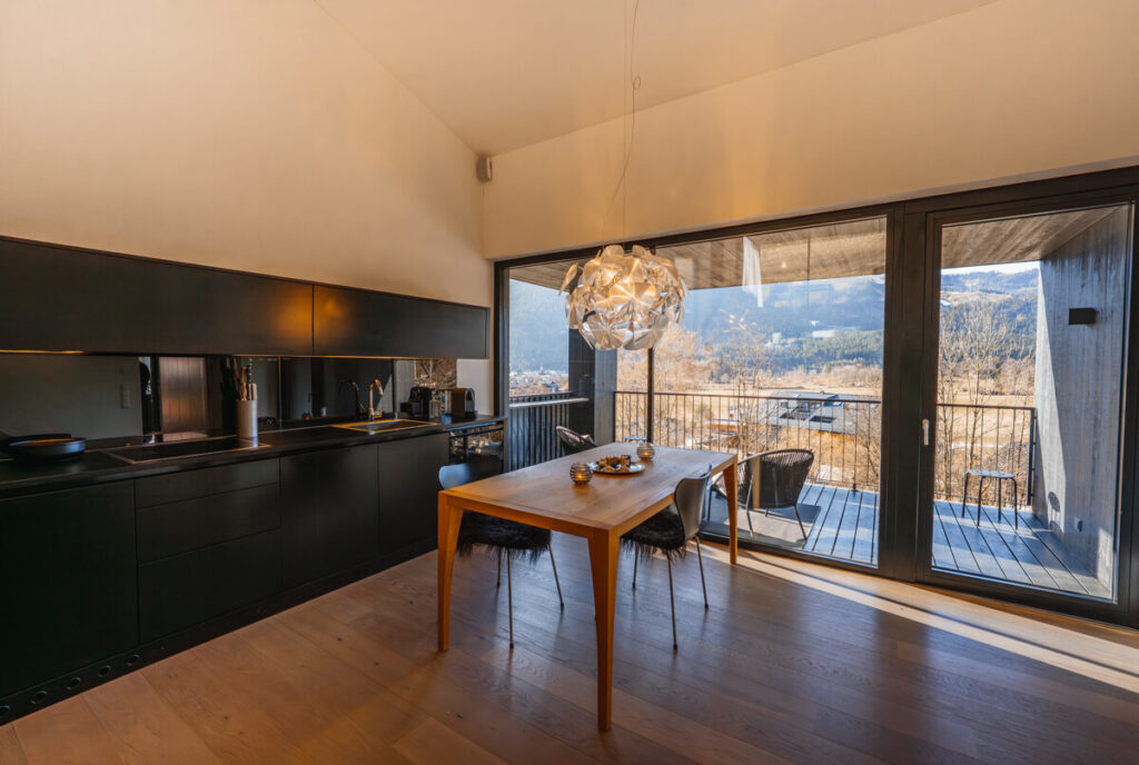Die erste Ebene bildet der offene Küchen- und Essbereich. Große Fensterflächen lassen viel Tageslicht in den Raum und eröffnen einen wunderschönen Blick ins Tal. Direkt angrenzend liegt die überdachte Terrasse, die sich wie eine Erweiterung des Wohnraums anfühlt und einen geschützten Platz im Freien bietet.