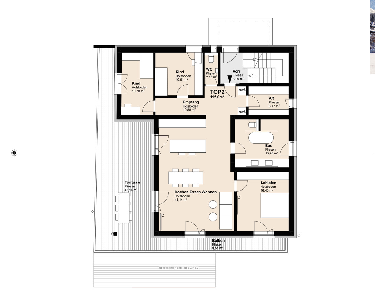 Die rund 115 m² große Wohnung begeistert mit einer durchdachten Raumaufteilung und hellen, großzügigen Wohnbereichen. Das Herzstück des Wohntraums ist der offene Wohn- und Essbereich mit direktem Zugang zur sonnigen Terrasse (42,16 m²) sowie einem zusätzlichen Balkon (8,57 m²). Dank großer Fensterflächen genießen Sie ganztägig Sonne, die für ein helles und angenehmes Wohnklima sorgt. Der unvergleichliche Ausblick auf die umliegende Berglandschaft ist zu jeder Jahreszeit ein Hingucker. Dieses Familienidyll ist ein Ort zum Ankommen und Wohlfühlen.