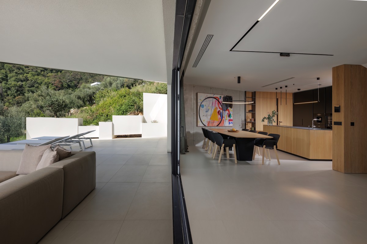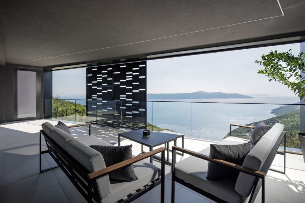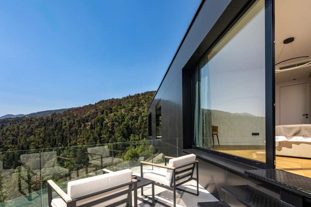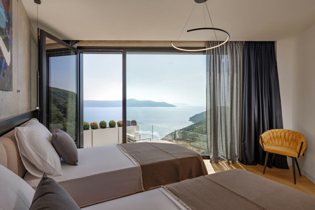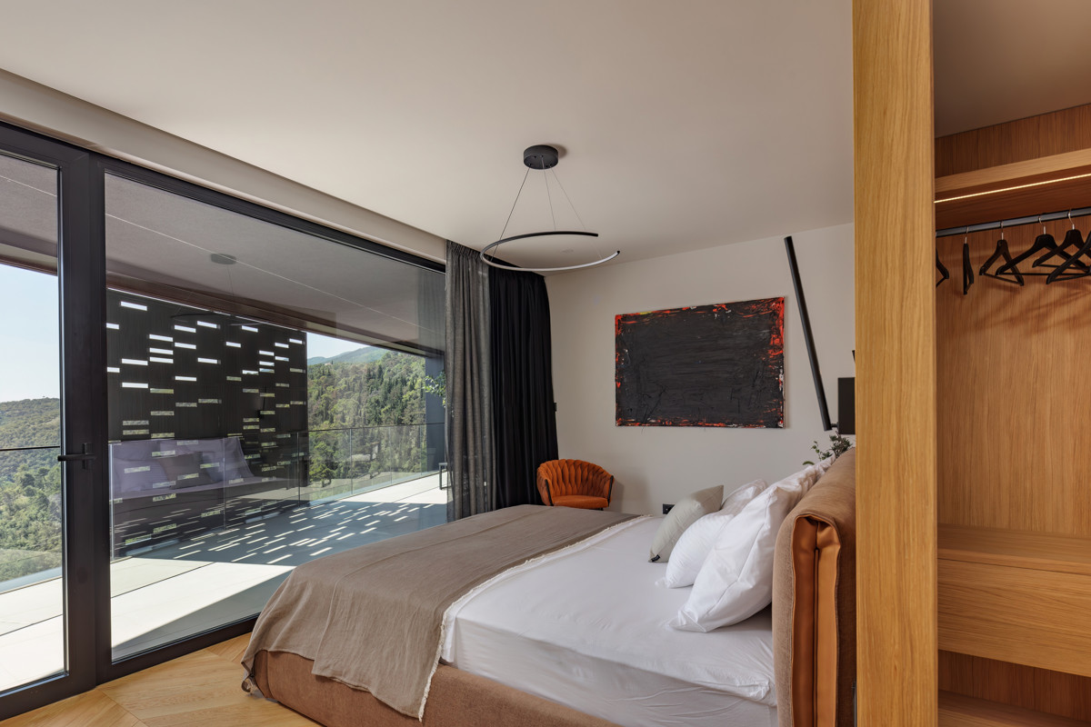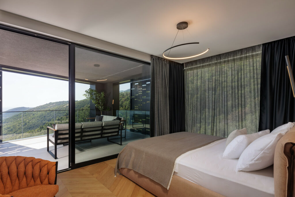 Im zweiten Stock befinden sich vier Schlafzimmer, jedes mit eigenem Bad und einzigartiger Aussicht, die durch raumhohe Fenster betont wird und viel Sonnenlicht hereinlässt. Bewegliche Aluminiumschirme sorgen für Privatsphäre. Die dreieckige Form der Villa ermöglicht es, dass jedes Zimmer einen atemberaubenden Blick auf die Küste und die umliegenden Berge bietet.