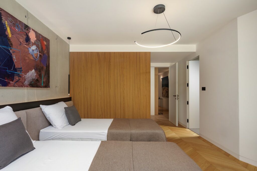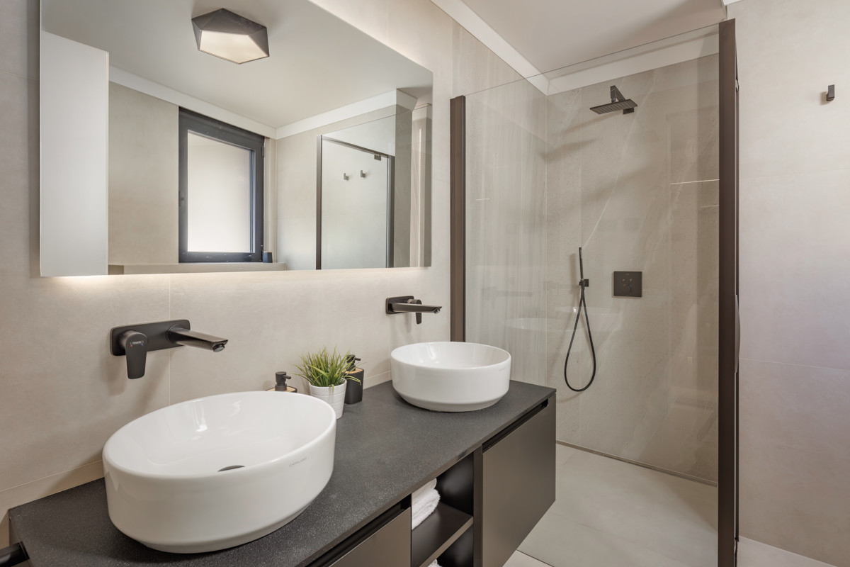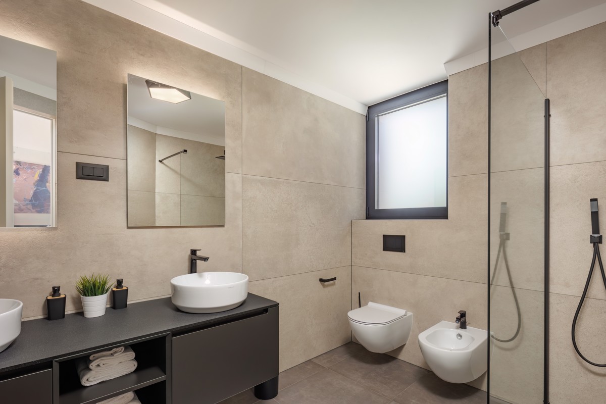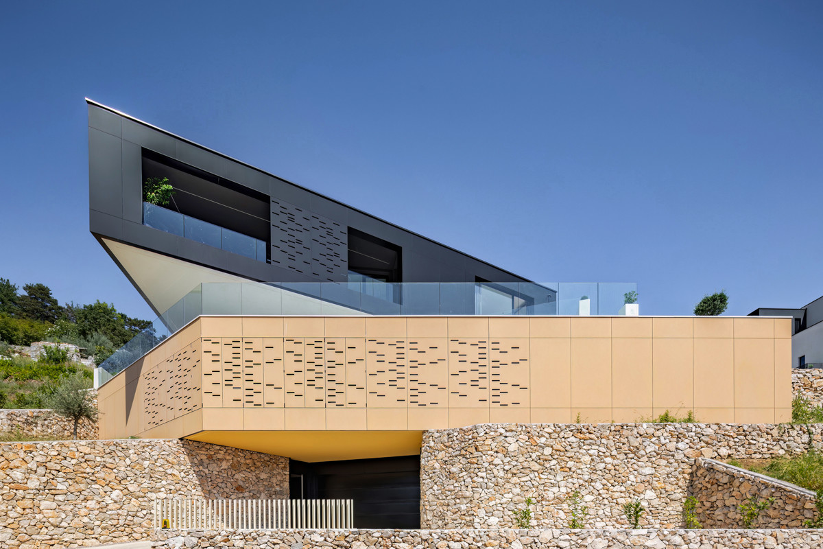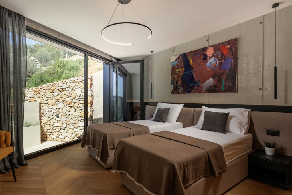 Im zweiten Stock befinden sich vier Schlafzimmer, jedes mit eigenem Bad und einzigartiger Aussicht, die durch raumhohe Fenster betont wird und viel Sonnenlicht hereinlässt. Bewegliche Aluminiumschirme sorgen für Privatsphäre. Die dreieckige Form der Villa ermöglicht es, dass jedes Zimmer einen atemberaubenden Blick auf die Küste und die umliegenden Berge bietet.