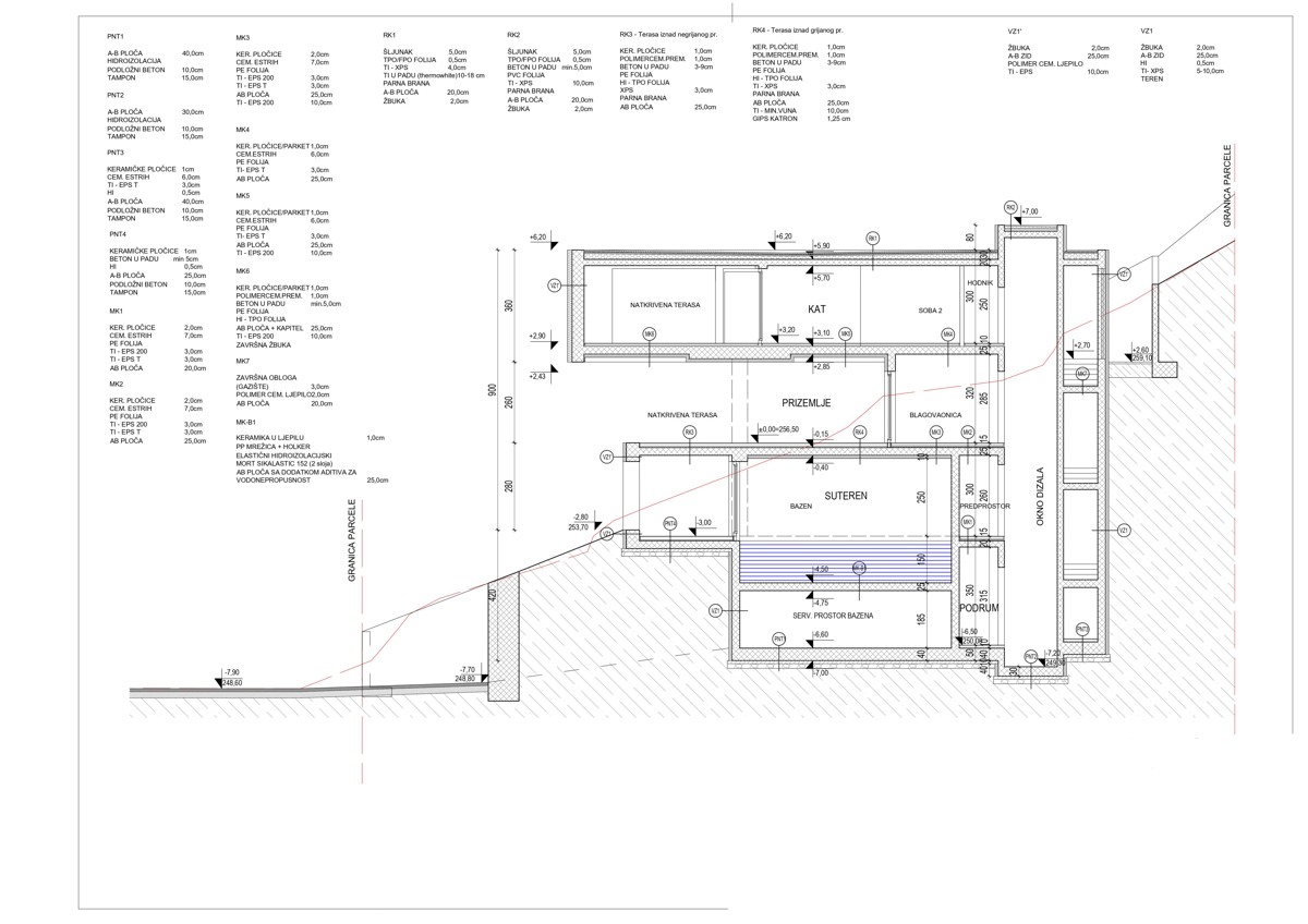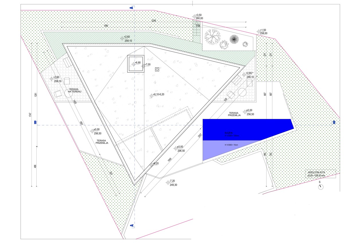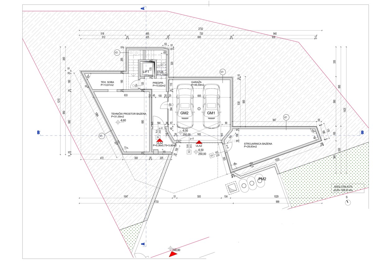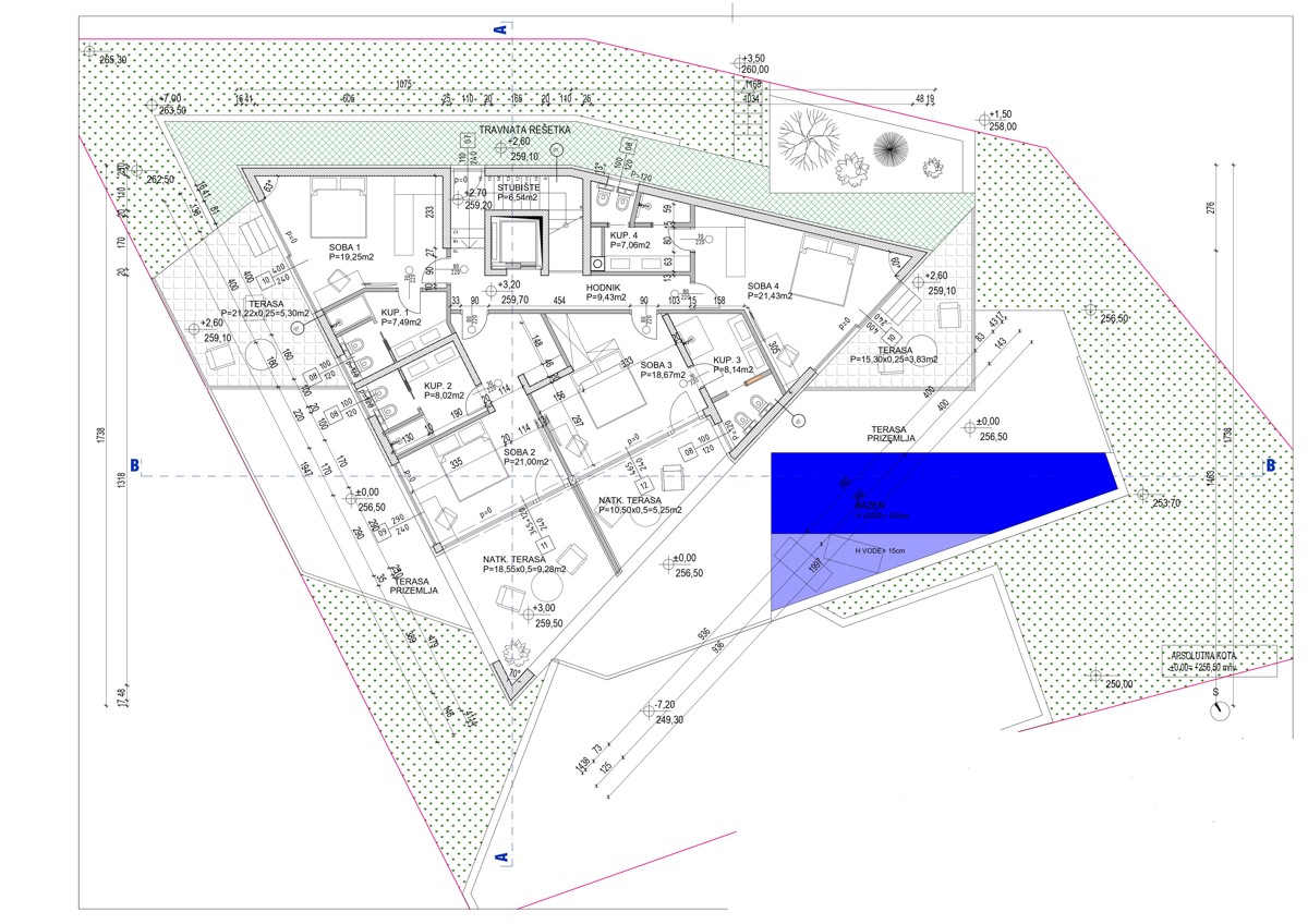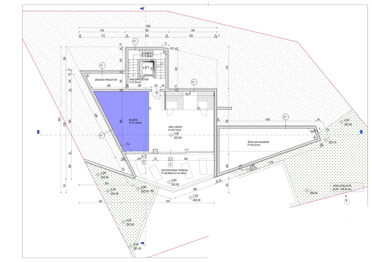 Die Villa verfügt über eine Gesamtbaufläche von 805 m², davon 296 m² Innenfläche, 335 m² Terrassen, 47 m² Garage, 61 m² Technikräume, 31 m² beheizten Innenpool und 35 m² Infinity-Außenpool, auf einem 917 m² großen Grundstück.