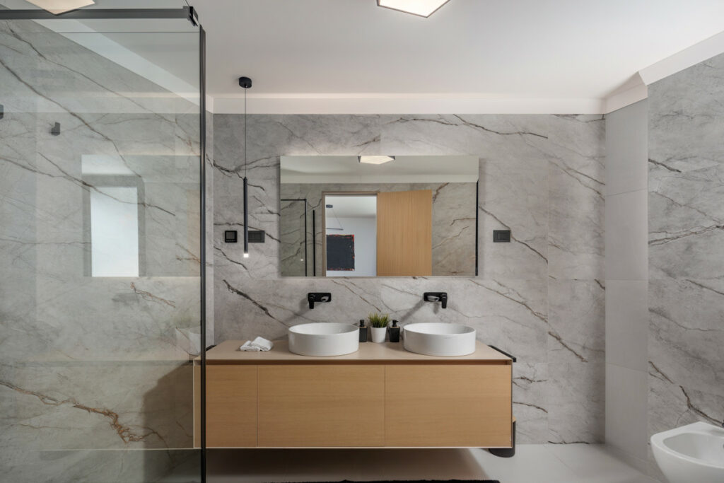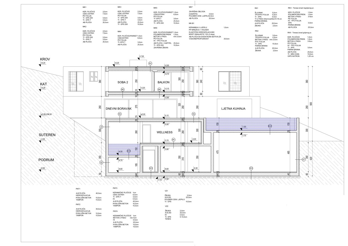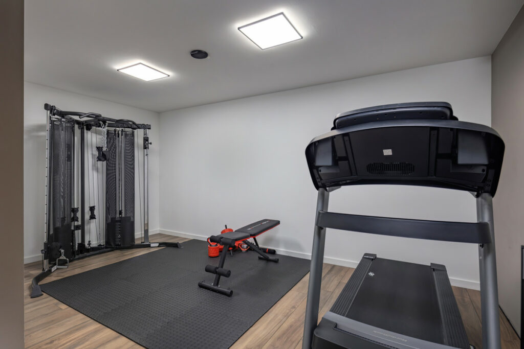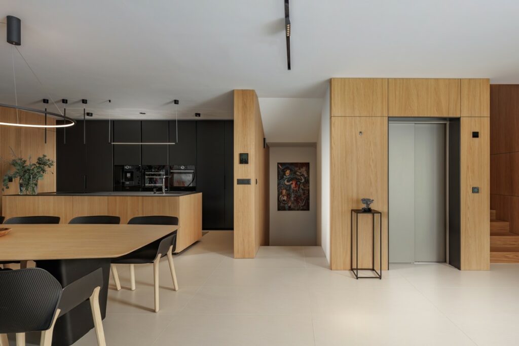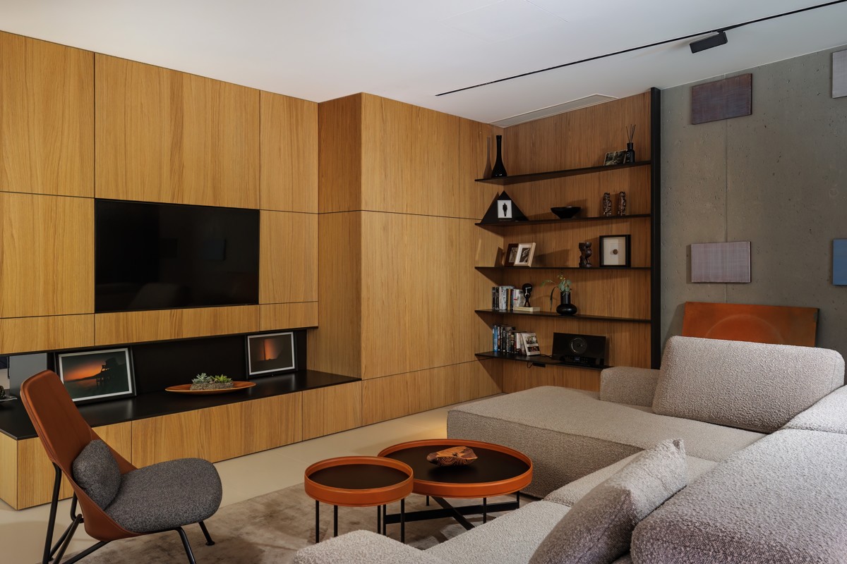 Im Untergeschoss, wo sich der Eingang zur Villa befindet, gibt es eine Garage und einen Technikraum für die Fußbodenheizung, das Wasserkühlsystem und die Luftfeuchtigkeitsregelung. Darüber liegt ein luxuriöser Wellnessbereich mit finnischer und türkischer Sauna, einem beheizten Innenpool mit Hydromassage-Bereich, einem Fitnessstudio und Liegestühlen auf der Terrasse. Schiebetüren aus Faserzementplatten bieten Privatsphäre und ermöglichen ungestörtes Sonnenbaden.