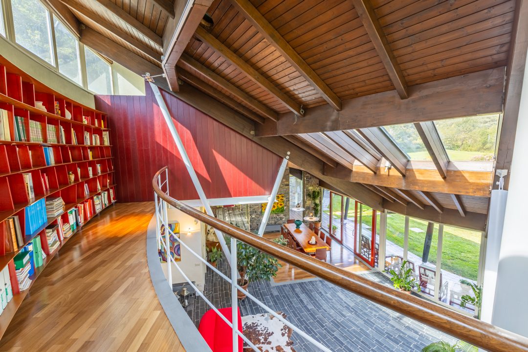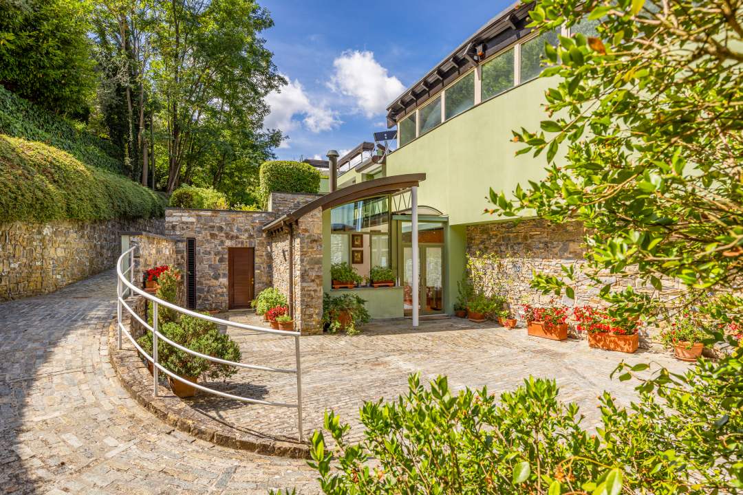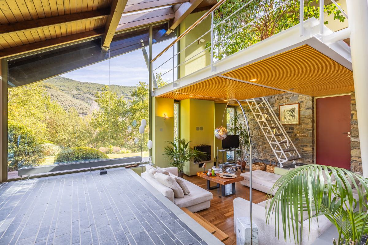 Dank der riesigen Fenster bietet sich aus diesen Räumen ein beeindruckender Blick auf den Garten und den privaten Wald: eine perfekt gelungene Verbindung zwischen dieser hochwertigen Realisierung und der umgebenden unberührten Natur, die sich romantisch bis zu den umliegenden Hügeln und Dörfern erstreckt.
