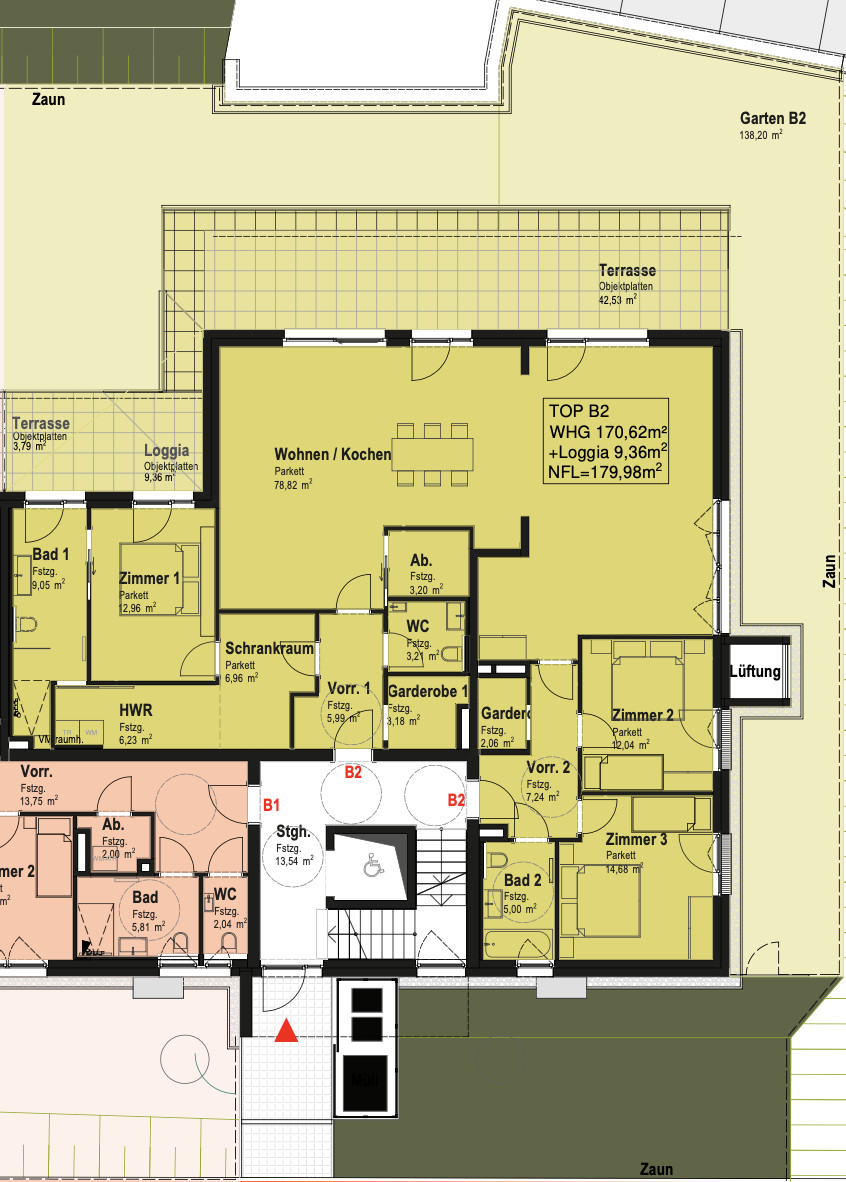 Die Wohnung verfügt über 3 Schlafzimmer, 2 Bäder, einem separaten WC, einem praktischen Hauswirtschaftsraum + Abstellraum, 2 Garderoben inklusive 2 Vorräumen und einem herrlich großen offenen Küchen-Ess-Wohnbereich. Von hier aus gelangen Sie auf die großzügige, sonnige Terrasse mit herrlicher Aussicht.