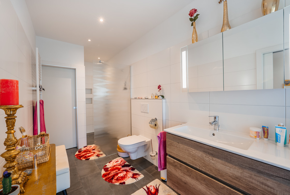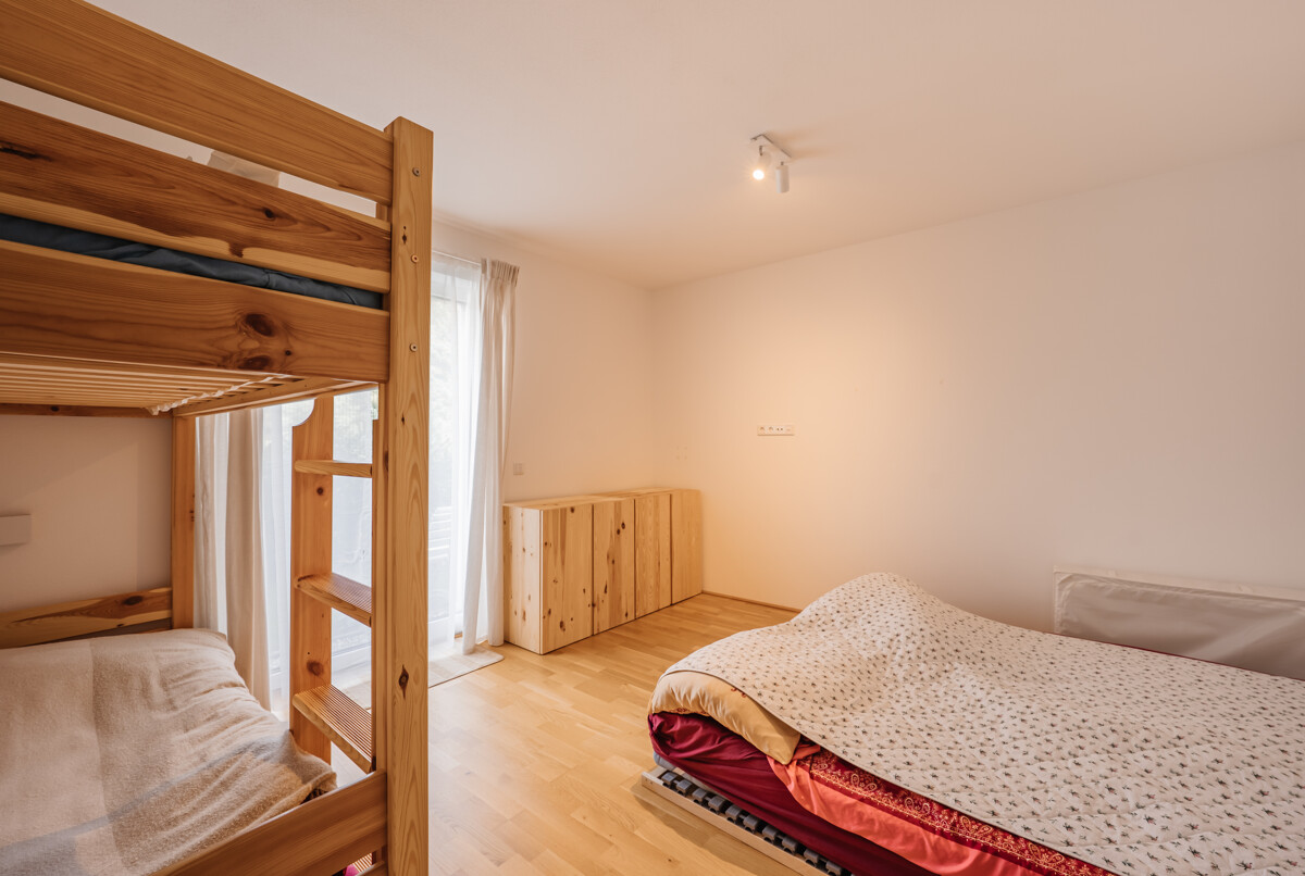 Der gut durchdachte Grundriss ist perfekt für eine Familie geeignet. Im Hauptschlafzimmer genießen Sie angenehme Privatsphäre, die beiden kleineren Schlafzimmer liegen direkt nebeneinander und bieten ausreichend Platz für Kinder oder Gäste. Beide Bereiche verfügen jeweils über ein Bad mit WC und Dusch- oder Bademöglichkeit.