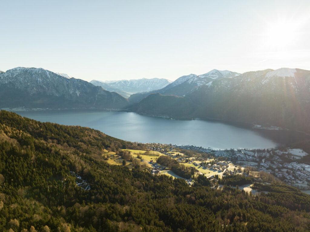 Die täglichen Schiffsverbindungen ab der Anlegestelle Unterach ermöglichen herrliche Ausflüge zu urig schönen Orten. Die Umgebung mit seiner Bergwelt, den verschiedenen Badeseen und üppiger Natur sorgt für vielfältige Freizeit-, Sport- und Naturerlebnissen. Ein perfektes Umfeld für Entdecker, Sportler und Naturliebhaber.