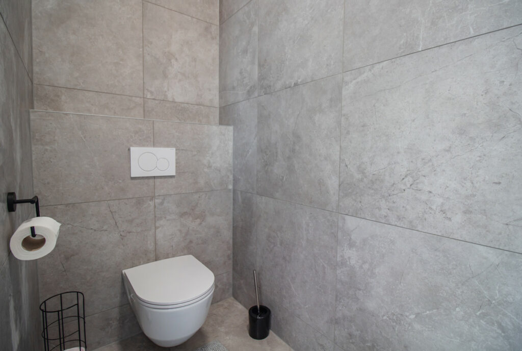 Das elegant ausgestattete Badezimmer verfügt über eine großzügige, bodengleiche Walk-in-Dusche, raumhoch geflieste Wände sowie ein separates WC.