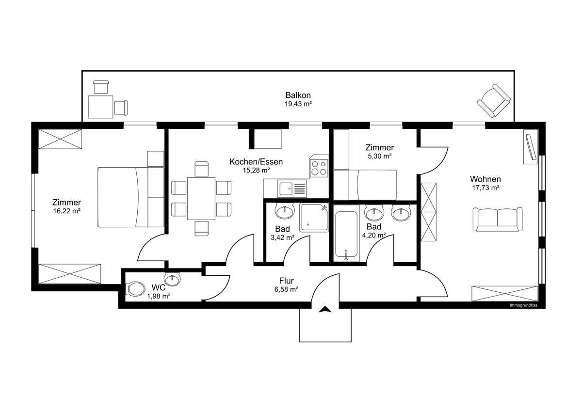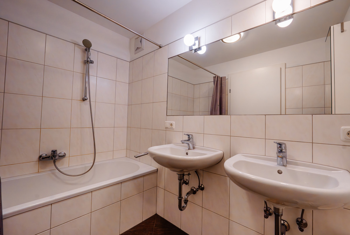 Die Wohnung verfügt über zwei Schlafzimmer, ein Wohnzimmer und eine praktische Küche mit Essbereich. Weiteres ist sie mit zwei Badezimmern – eines mit Dusche, eines mit Badewanne und zwei Waschbecken, sowie einem separaten Gäste-WC ausgestattet.