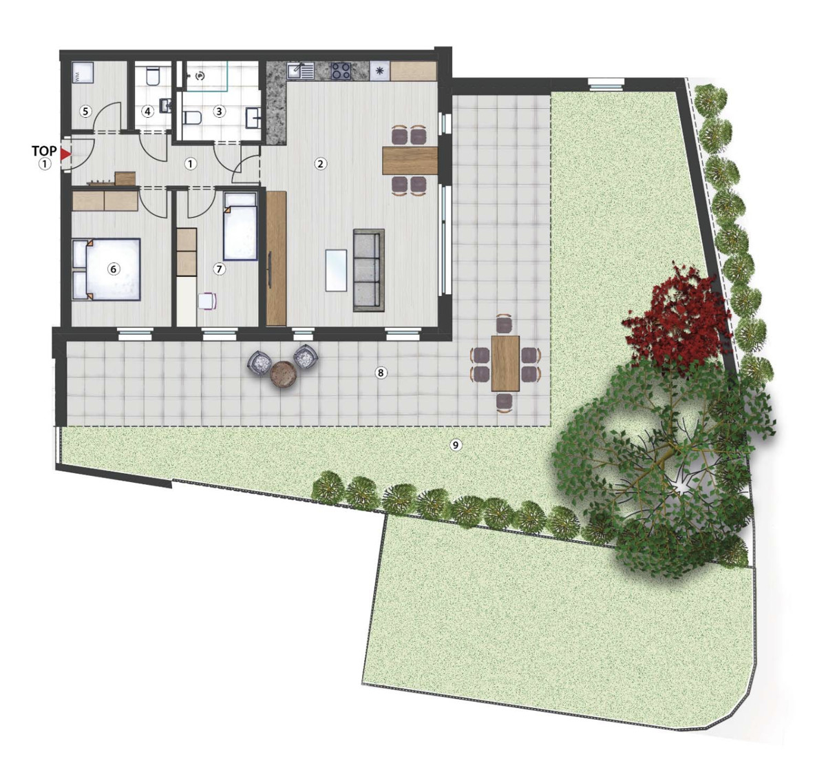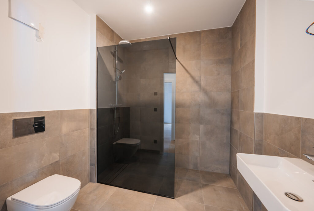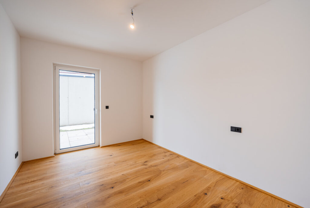 Die Wohnung Top 1 verfügt mit einer Wohnfläche von ca. 80 m² über 2 Schlaf- und ein Badezimmer. Sie befindet sich im Untergeschoss, jedoch hat sie aufgrund der Hanglage des Hauses einen ca. 97 m² großen Garten.