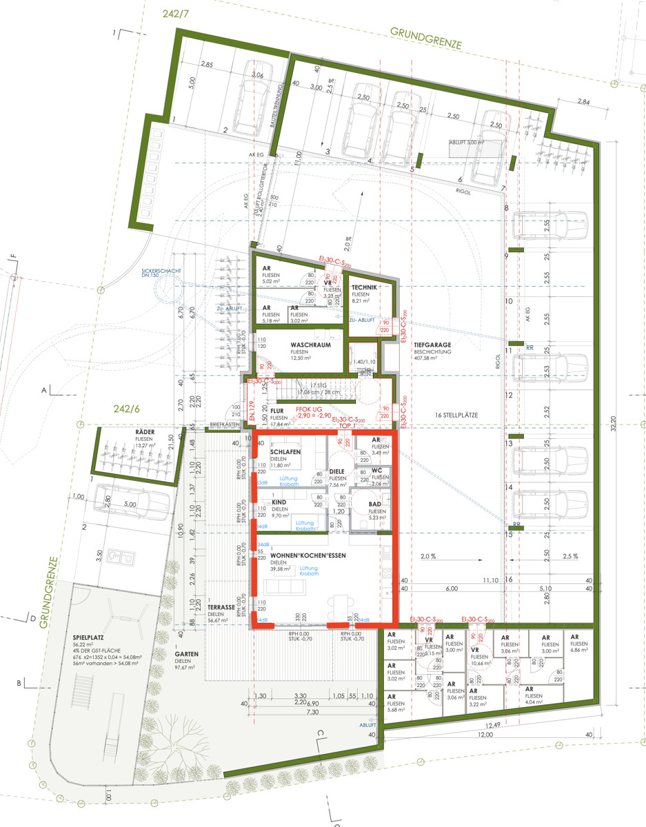 Ein Tiefgaragenplatz kann für 24.500 € zusätzlich erworben werden.