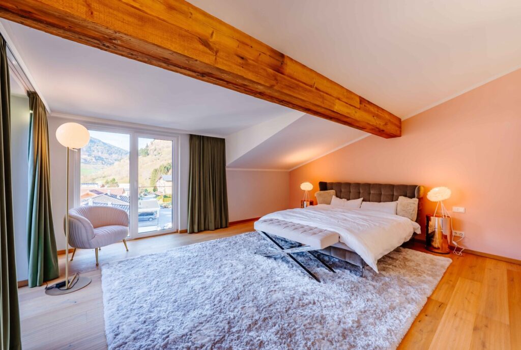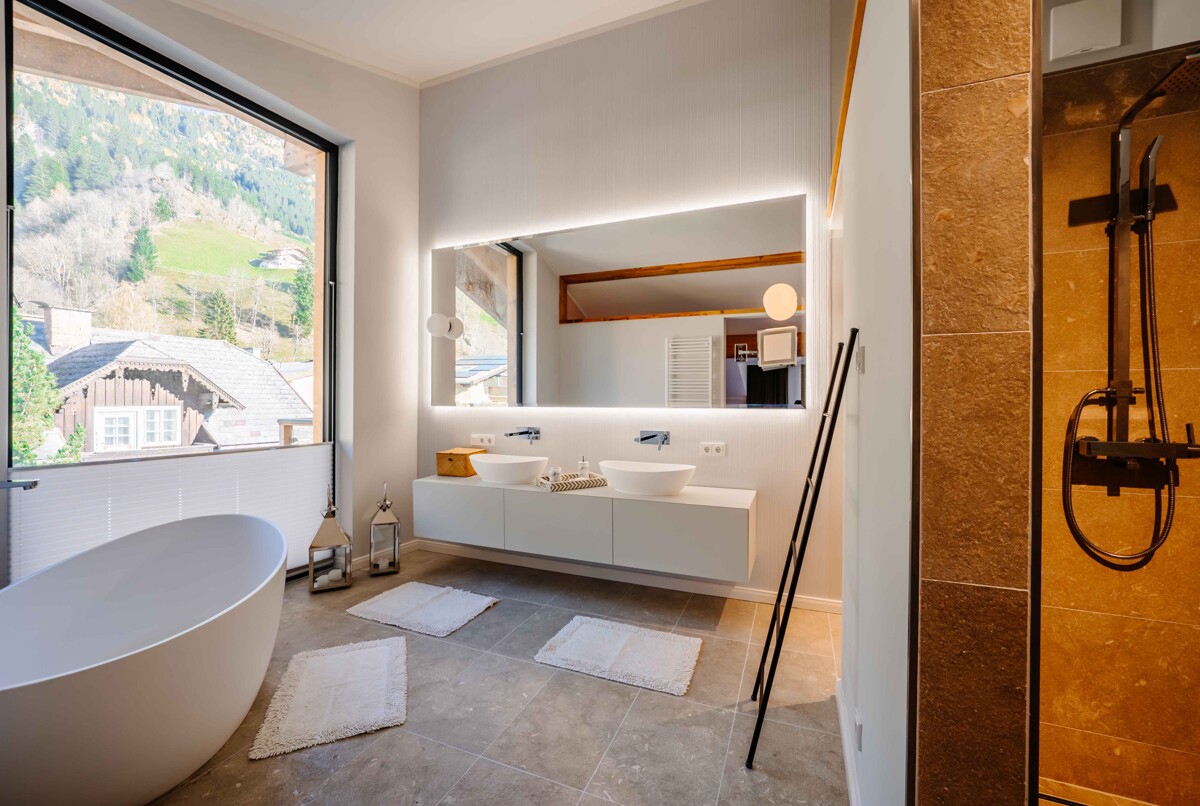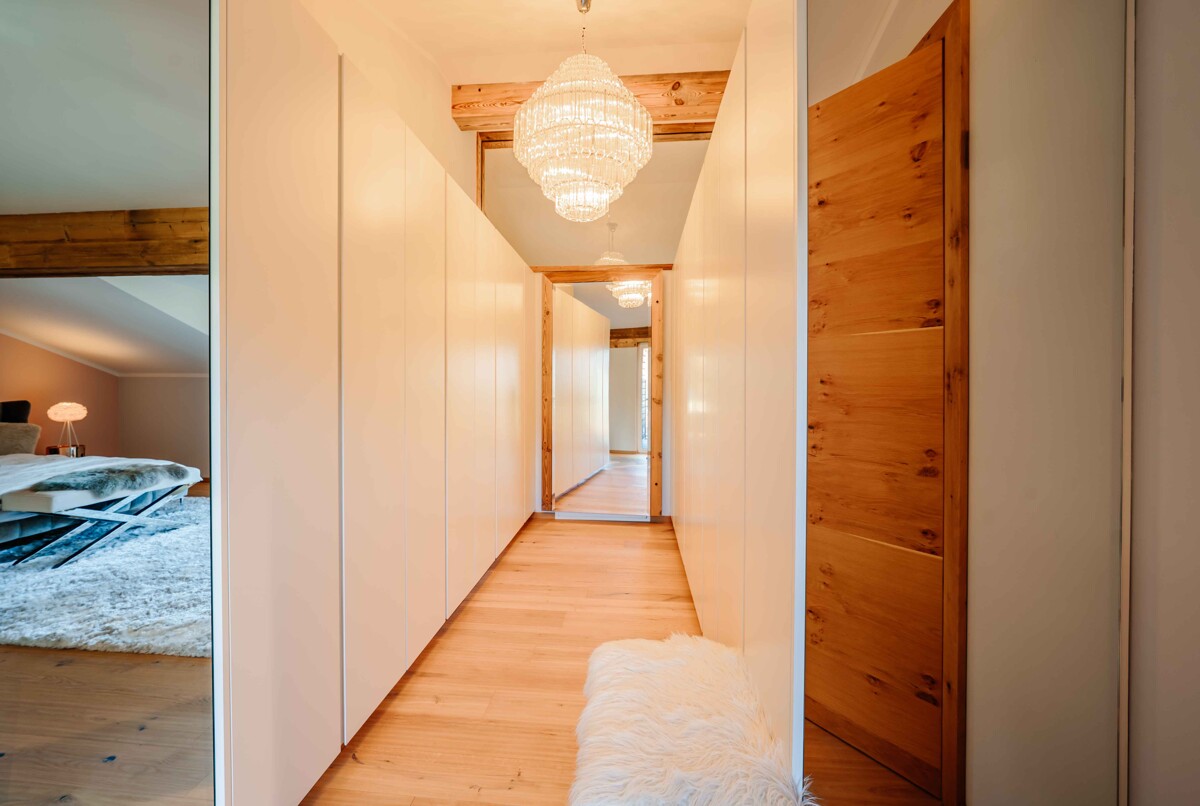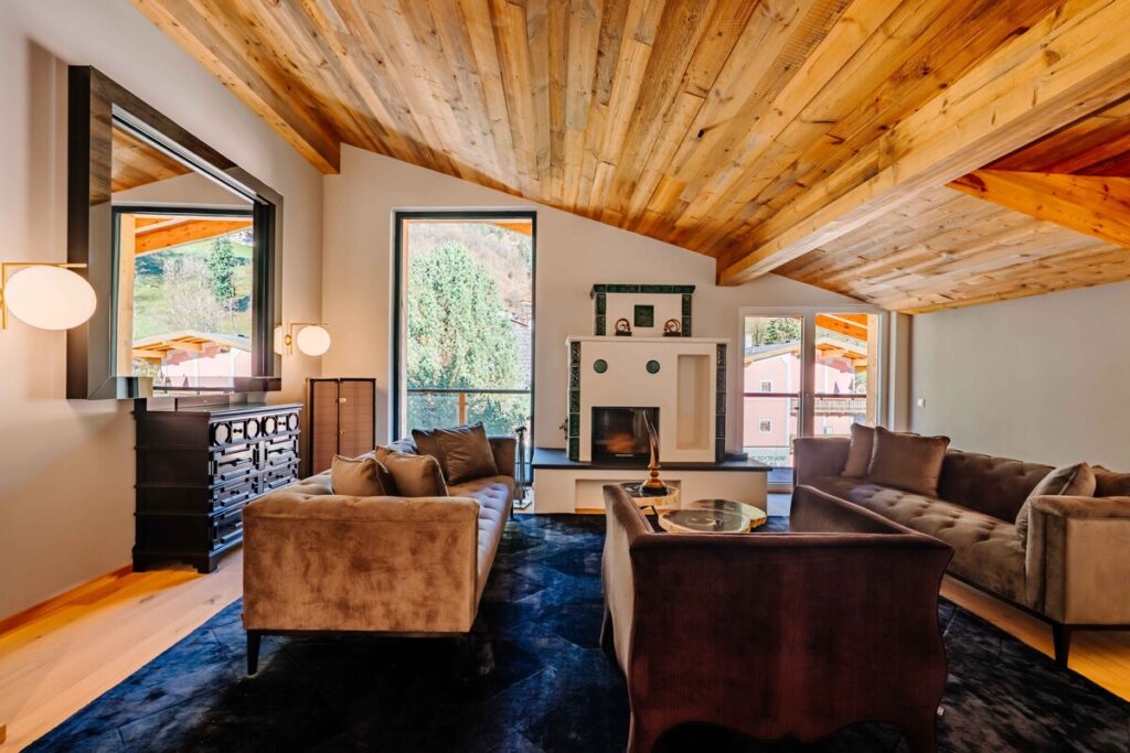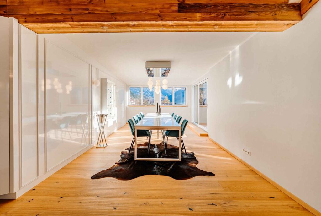 Massive Holzbalken, Echtholzböden und Naturstein bringen natürliche Wärme und Beständigkeit in den Räumlichkeiten.Die großen Fensterfronten holen das Licht und die umliegende Landschaft direkt ins Innere – Innen und Außen verschmelzen zu einem stimmigen Ganzen. Das Ergebnis ist ein harmonisches Zusammenspiel aus alpinem Flair und moderner Architektur – klar, hochwertig und zeitlos.