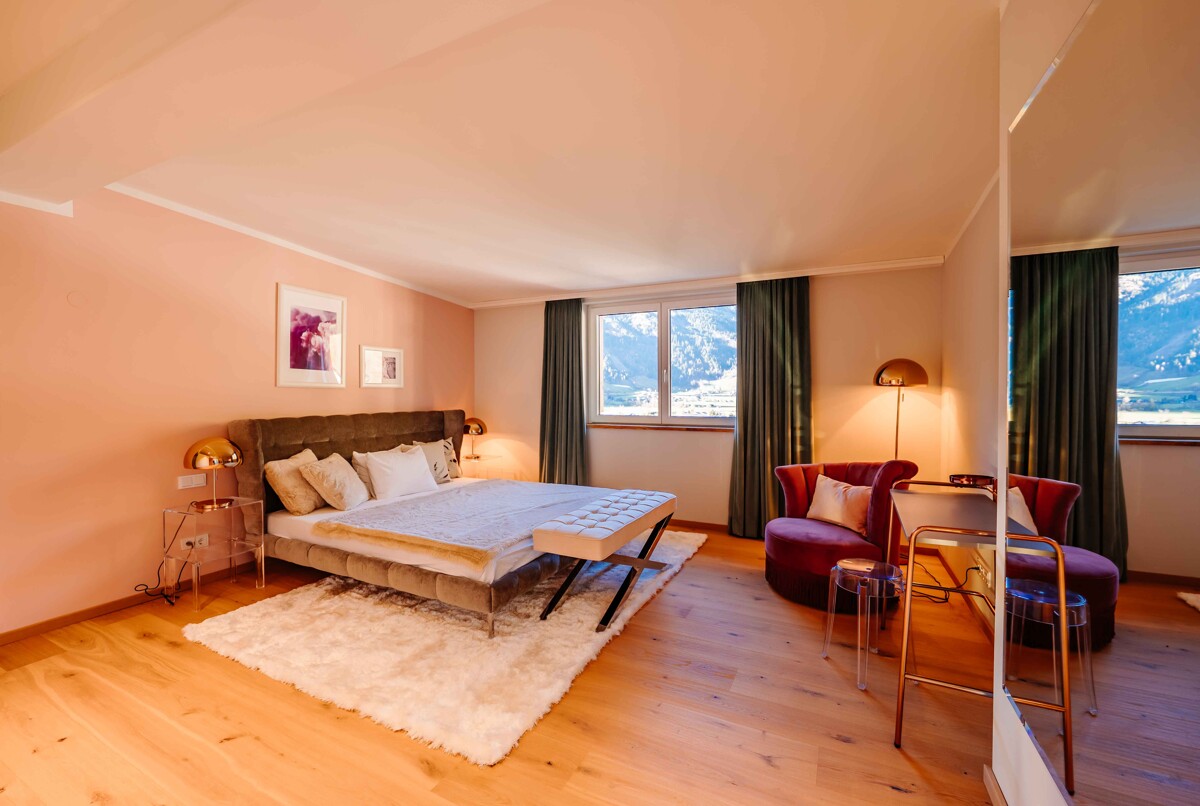 Anschließend an den Essbereich befindet sich eine Bar mit kleiner Teeküche und Dachfenster – praktisch und harmonisch in den Raum integriert. Sie führt weiter zur gemütlichen Leseecke mit Sofa und direktem Zugang zur südseitigen Terrasse. Am Ende des offenen Wohnbereichs lädt ein großes Sofa zum Entspannen ein. Durch die weiten Fensterfronten fällt viel Tageslicht herein, und der Blick in die umliegende Bergwelt sorgt für ein besonderes Raumgefühl. Der Zugang zum Balkon verstärkt das Gefühl von Offenheit und Weite – innen und außen gehen hier nahtlos ineinander über. So fließen Küche, Essen, Bar, Leseecke und Wohnraum ineinander – offen, verbunden und doch klar strukturiert.