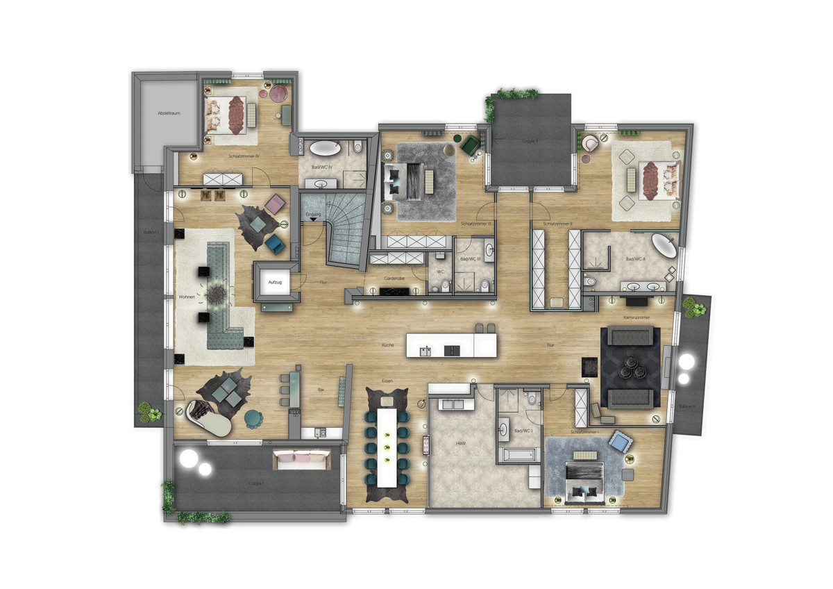 Die Penthouse verfügt über insgesamt vier Schlafzimmer, jedes mit eigenem En-Suite Badezimmer.Eines der Schlafzimmer liegt direkt angrenzend an den offenen Wohnbereich – ideal für Gäste. Die drei weiteren Schlafzimmer befinden sich auf der gegenüberliegenden Seite, wodurch eine angenehme räumliche Trennung zwischen den Wohn- und Ruhebereichen entsteht.Im hinteren Bereich liegt der großzügige Masterbereich mit Ankleideecke, offener Badewanne, Doppelwaschbecken, Dusche, WC und direktem Zugang zur nordseitigen Terrasse. Dort erwarten Sie außerdem eine Outdoordusche sowie die Möglichkeit, eine Sauna zu integrieren.