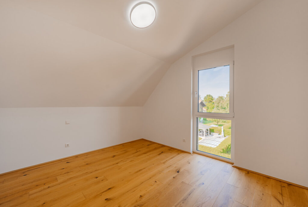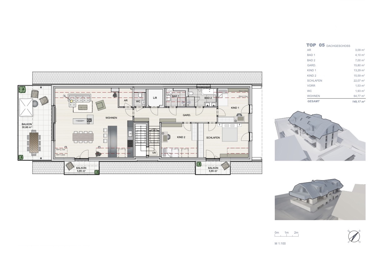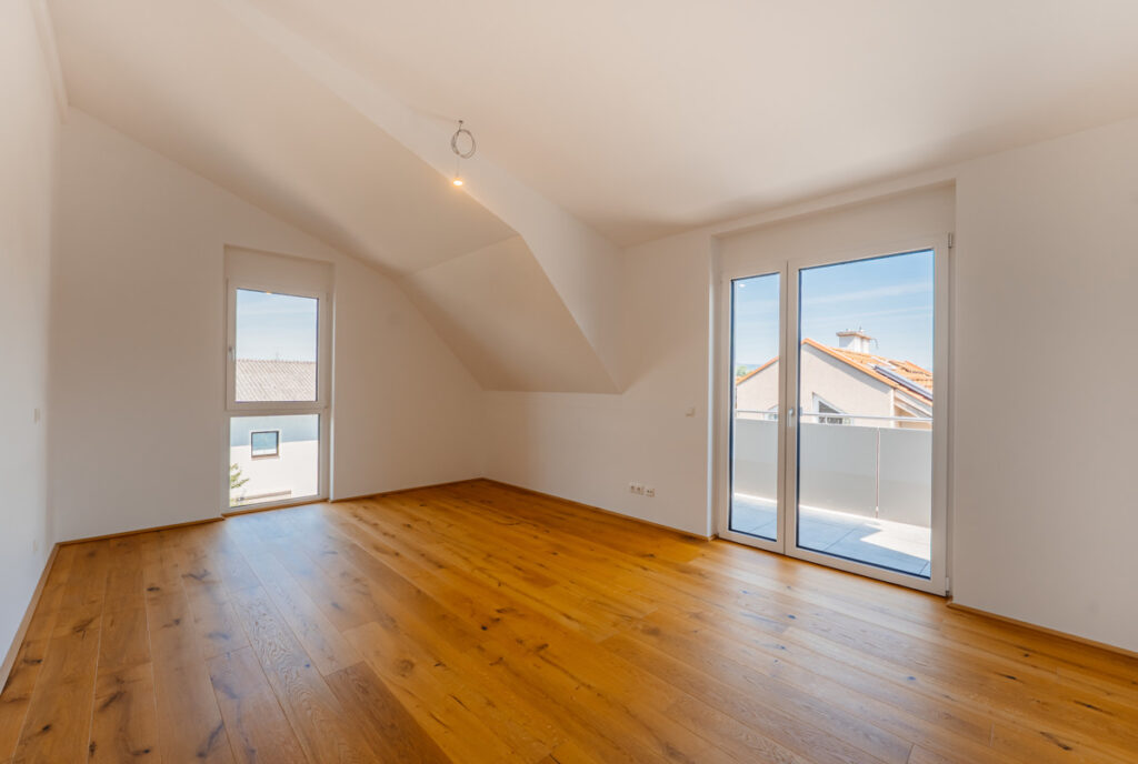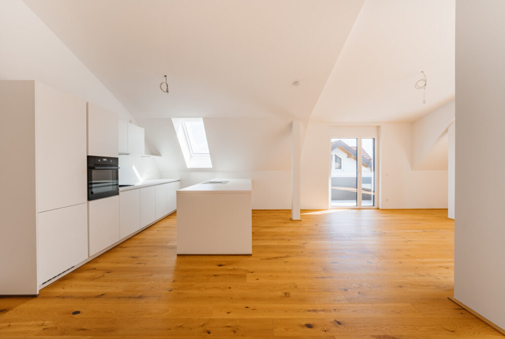 Der offene Wohn-/Essbereich mit einer modernen weißen Küche samt Küchenblock lädt zu geselligen Stunden ein. Die bodentiefen Fenster sorgen für viel Tageslicht und führen auf eine rund 30 m² große, teilweise überdachte Dachterrasse. Genießen Sie tagtäglich den Weitblick auf die Gipfel der umliegenden Berge und die perfekte Ausrichtung des Outdoorbereichs in Richtung Süd-West. 2 weitere Balkone erweitern den Außenbereich und sind sowohl von einem Schlafzimmer als auch vom Wohn-/Essbereich zugänglich.