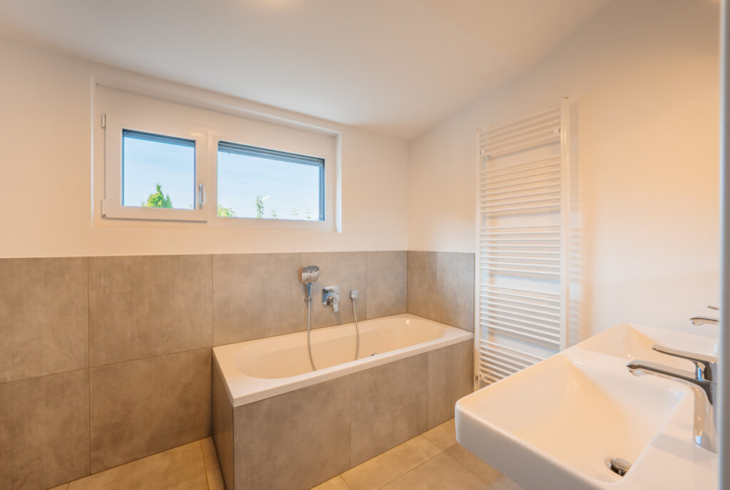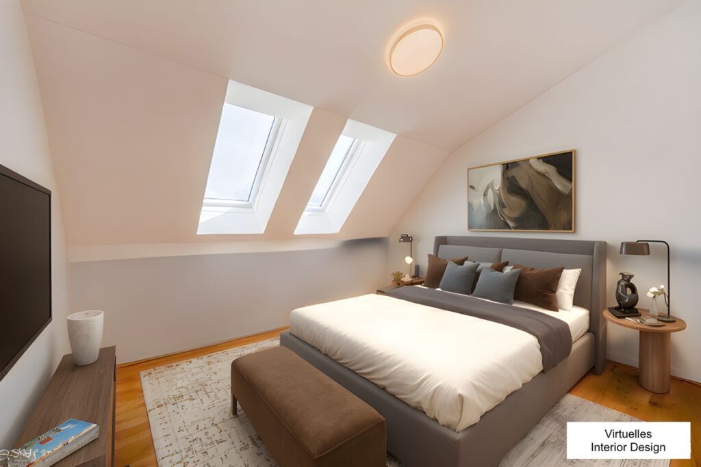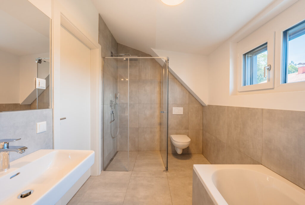 Diese Dachgeschosswohnung verfügt über 2 ausgestattete Badezimmer – eines davon mit sowohl einer Badewanne als auch einer Dusche. Zusätzlich steht ein separates Gäste-WC zur Verfügung, was für zusätzlichen Komfort und Privatsphäre im Alltag sowie bei Besuch sorgt.