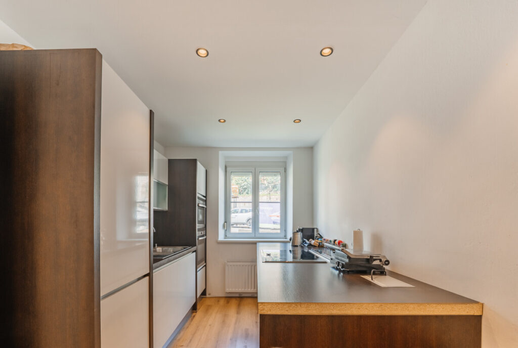 Die Einbauküche ist separat gelegen und besticht durch ihre durchdachte Ausstattung. Sie bietet genügend Arbeitsfläche sowie praktische Schränke für eine übersichtliche Organisation. Mit modernen Geräten ausgestattet, unterstützt sie einen angenehmen und effizienten Kochablauf – ideal für alle, die gerne kochen und Wert auf Funktionalität legen