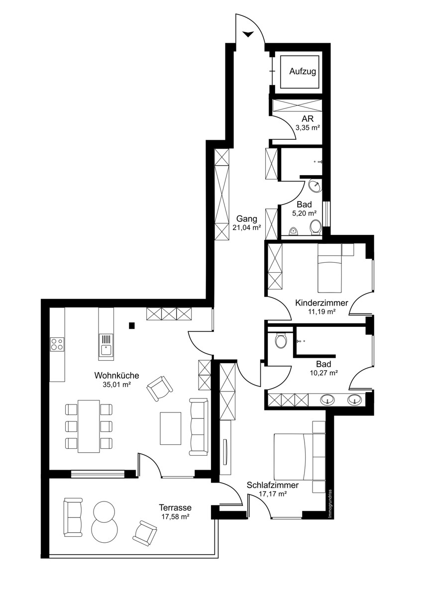 Die Dachgeschosswohnung Top 7 bietet eine großzügige Wohnfläche von 103,23 m² und umfasst 3 Zimmer, die ideal geeignet sind für eine komfortable und luxuriöse Lebensweise. Die Wohnung verfügt über zwei Schlafzimmer, von denen eines mit einem Bad en suite ausgestattet ist. Ein weiteres Schlafzimmer sorgt für genügend Raum für Familie oder Gäste. Ein weiteres Highlight dieser Wohnung ist der direkte Zugang zur Wohnung per Lift, was zusätzlichen luxuriösen Komfort und Barrierefreiheit garantiert. Eine angenehme Terrasse mit 17,58 m² rundet das besondere Wohlfühlgefühl der Dachgeschosswohnung ab.