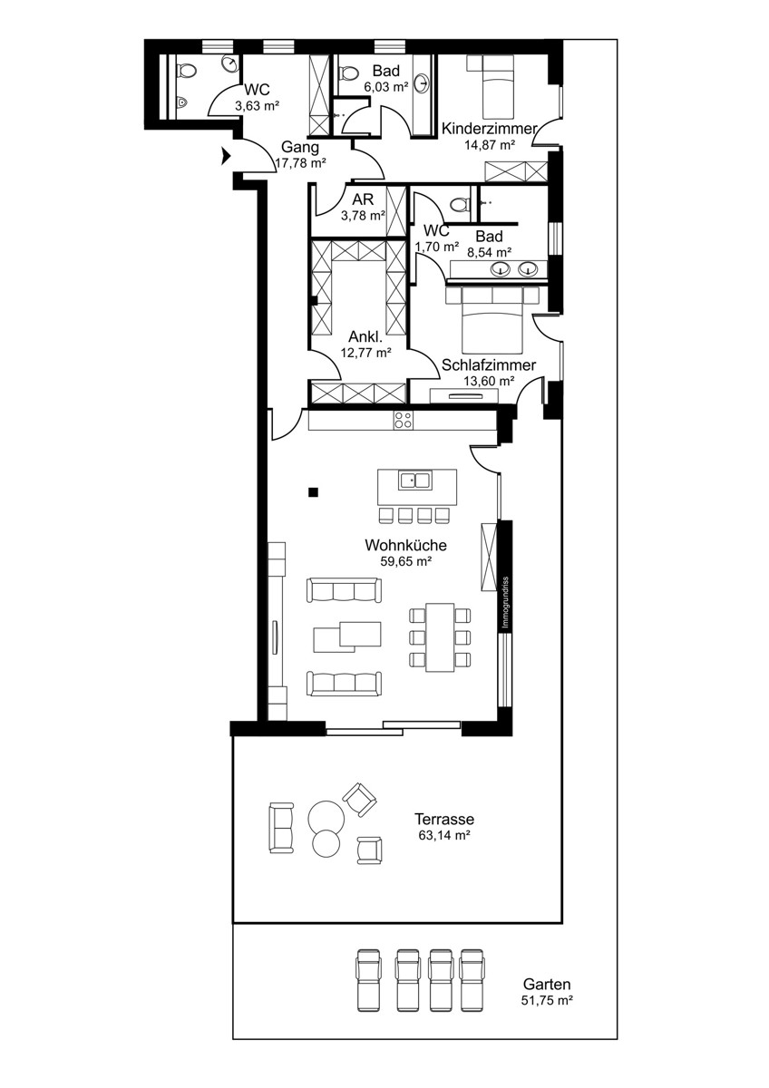 Die Wohnung Top 6 im 2.Obergeschoss bietet eine großzügige Wohnfläche von 142,35 m² und beeindruckt mit einem großflächigen Outdoorbereich: Zusätzlich zur schönen Terrasse mit 63,14 m² gibt es noch einen eigenen Garten mit 51,75 m².