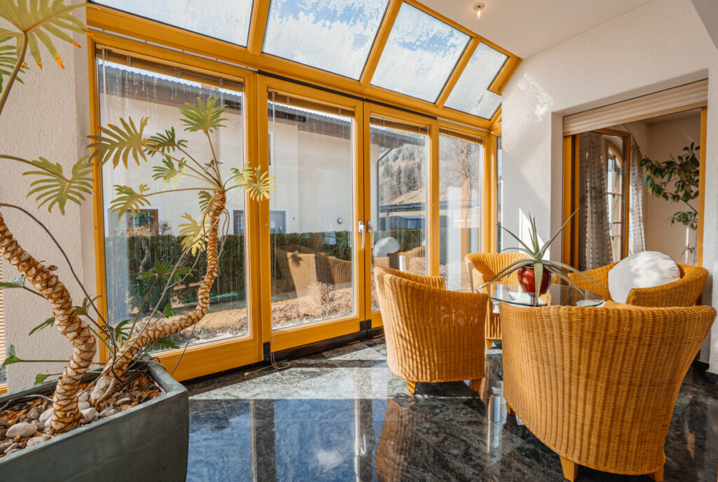 Der Koch- und Essbereich bietet nicht nur funktionale Perfektion, sondern auch einen direkten Zugang zur sonnigen Terrasse und dem angrenzenden Garten, wodurch Innen- und Außenbereich harmonisch miteinander verschmelzen. Der Wohnbereich mit Kamin wird durch einen eleganten Wintergarten erweitert, der als lichtdurchfluteter Rückzugsort dient und ebenfalls einen direkten Zugang zur Terrasse sowie in den Garten ermöglicht.