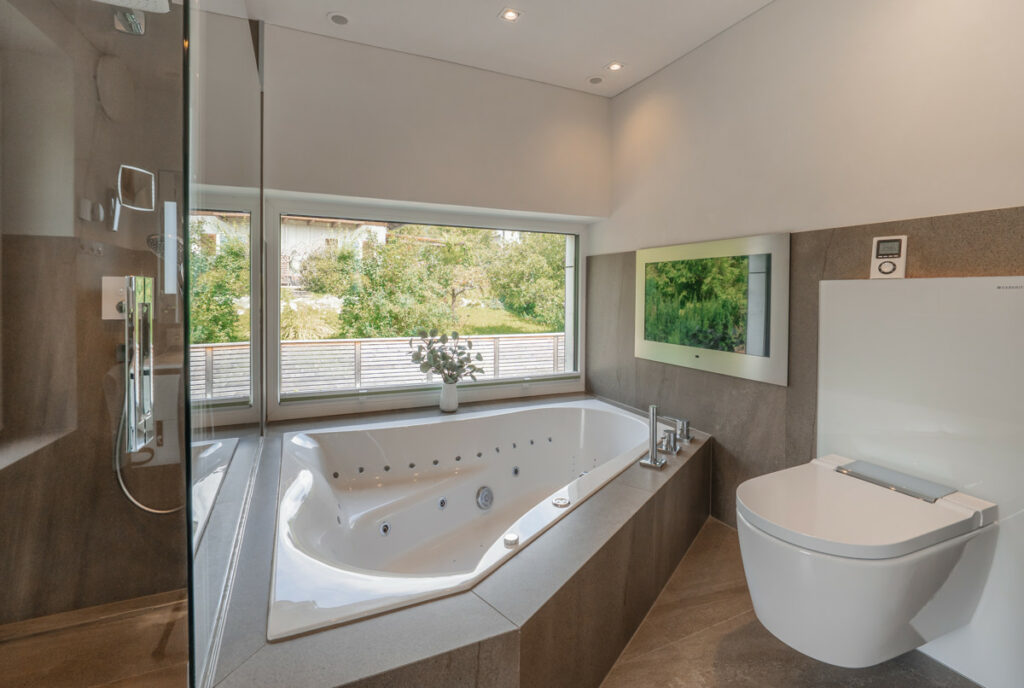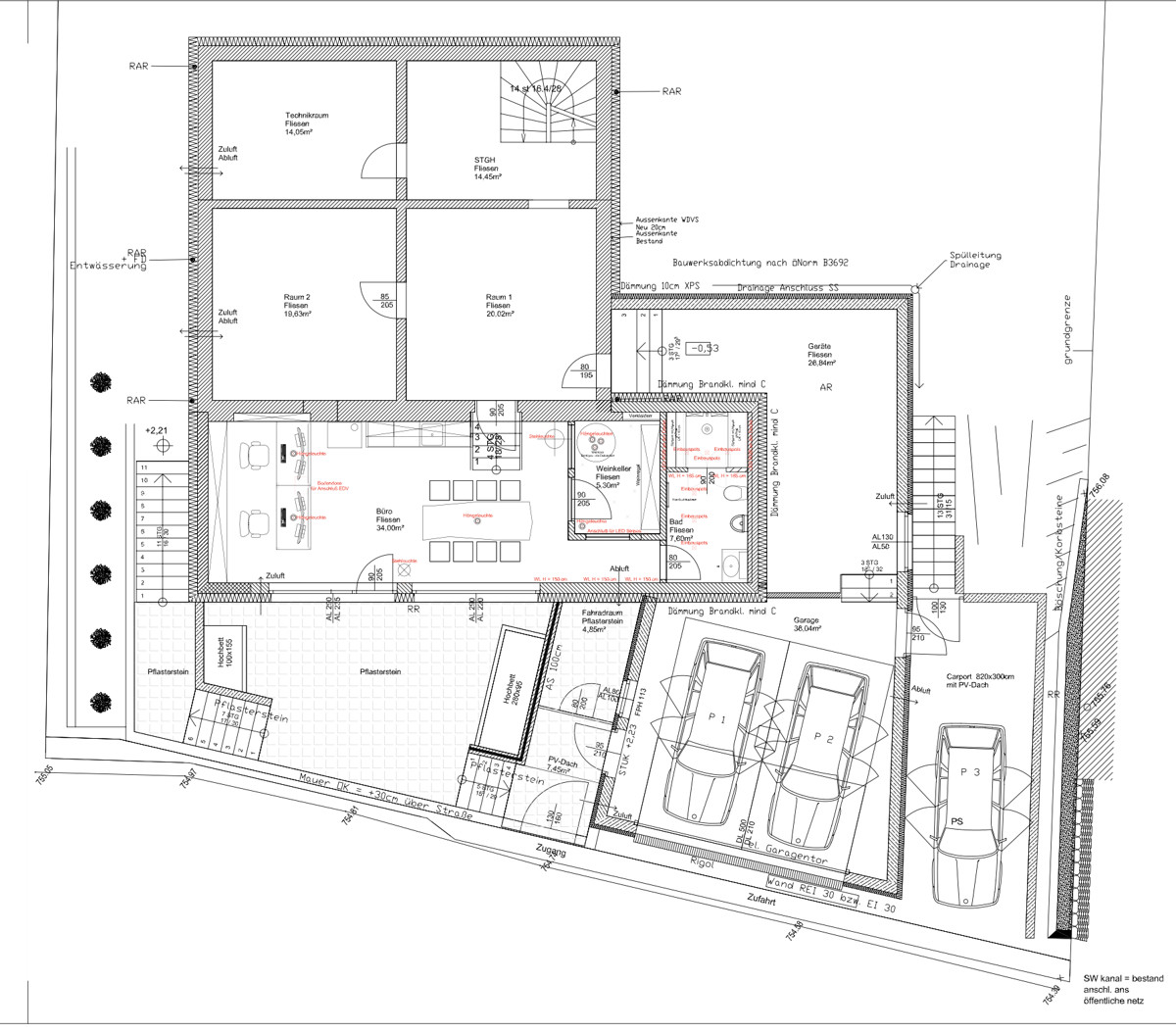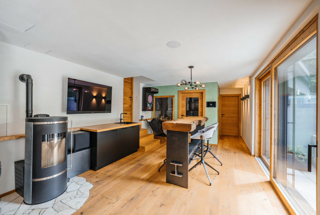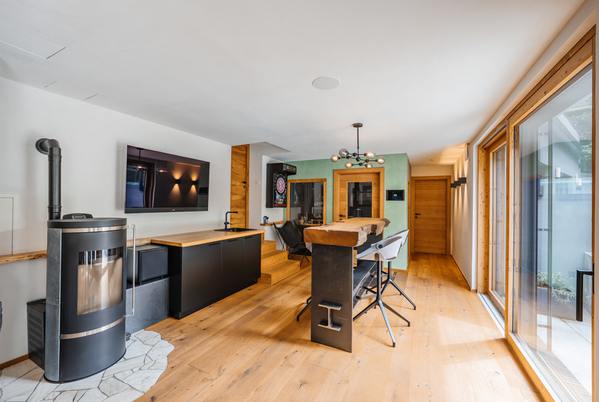 Das Untergeschoss mit angenehmen Tageslicht verfügt über einen separaten Eingang, einem Bad, Bar, einem Büro oder Einliegerwohnung, einem Weinkeller, einer Werkstatt, einer Doppelgarage und einer E-Ladestationen (3x 11 kW).