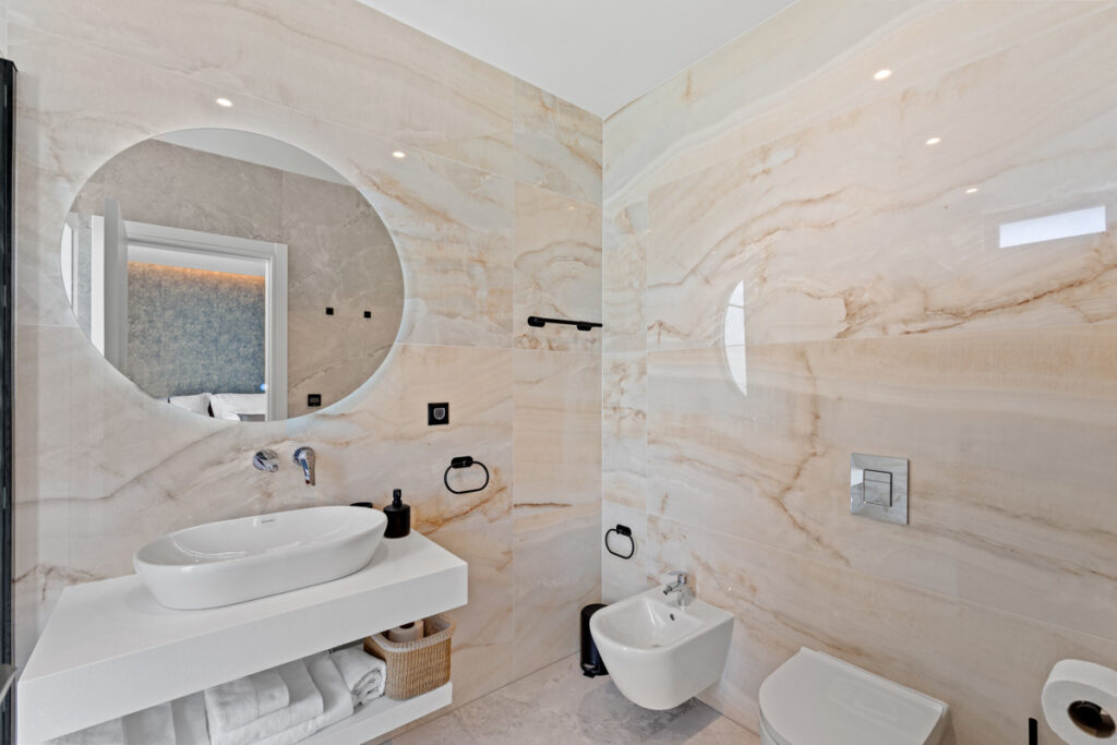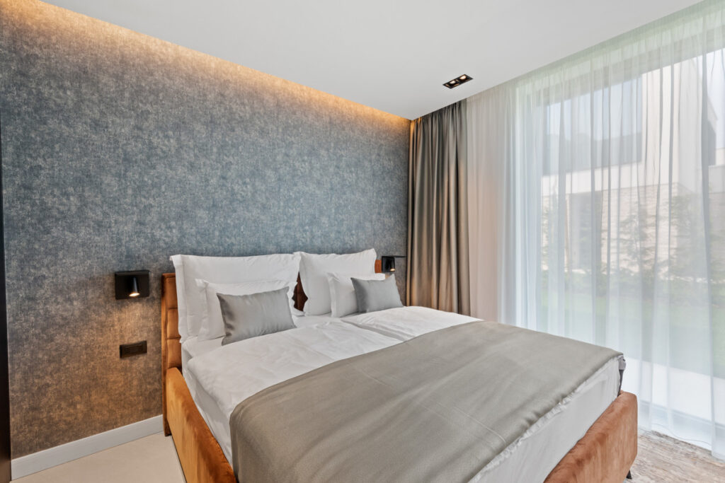 Die vier geräumigen Schlafzimmer sind stilvoll eingerichtet und jedes verfügt über ein eigenes Badezimmer mit modernen Armaturen und luxuriösen Annehmlichkeiten. Das lichtdurchflutete Wohnzimmer bietet gemütliche Sitzgelegenheiten und ist durch den offenen Grundriss nahtlos mit dem Essbereich und der voll ausgestatteten Küche verbunden.