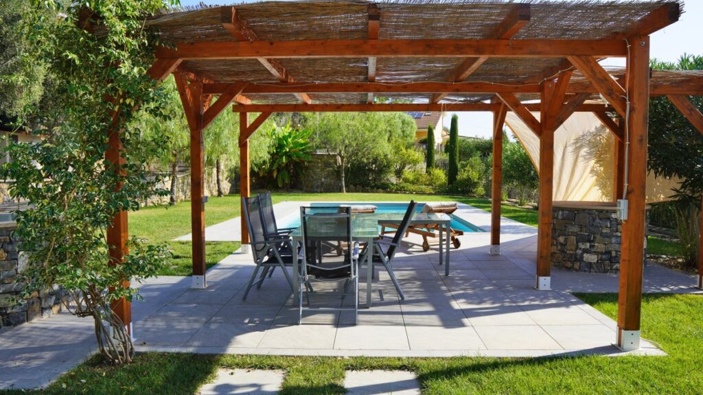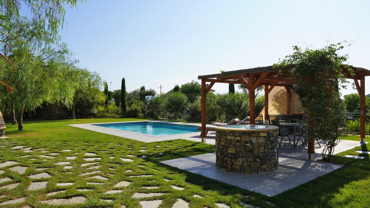 Der Garten ist ein wahres Spektakel: Der englische Rasen und die malerischen Pflanzen schmücken ihn gekonnt, während sich ein herrlicher Swimmingpool neben einem gut ausgestatteten und schattigen Essbereich im Freien befindet, der zum Verweilen und Genießen einlädt.
