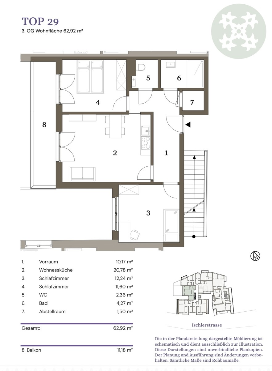 Das Appartement „TOP 29“ befindet sich im 3. Obergeschoss und ist mit dem Personenaufzug sowohl vom Erdgeschoss als auch von der Tiefgarage aus bequem erreichbar. Beim Betreten der Wohnung gelangen Sie vom geräumigen Vorraum mit Abstellraum in die weiteren Räume. Das moderne Bad ist mit einer Dusche und einem praktischen Waschmaschinenanschluss ausgestattet. Das WC ist separat. Zwei elegante Schlafzimmer sorgen für den perfekten Schlaf. Verbringen Sie geruhsame Abende im Herzstück des Appartements, dem großzügigen Wohn-Küchen-Essbereich, der durch die großen Fensterfronten freundlich und einladend wirkt. Vom Wohnzimmer aus gelangen Sie auch auf den geräumigen Balkon. Hier können Sie an der frischen, klaren Bergluft das wunderbare Bergpanorama genießen.